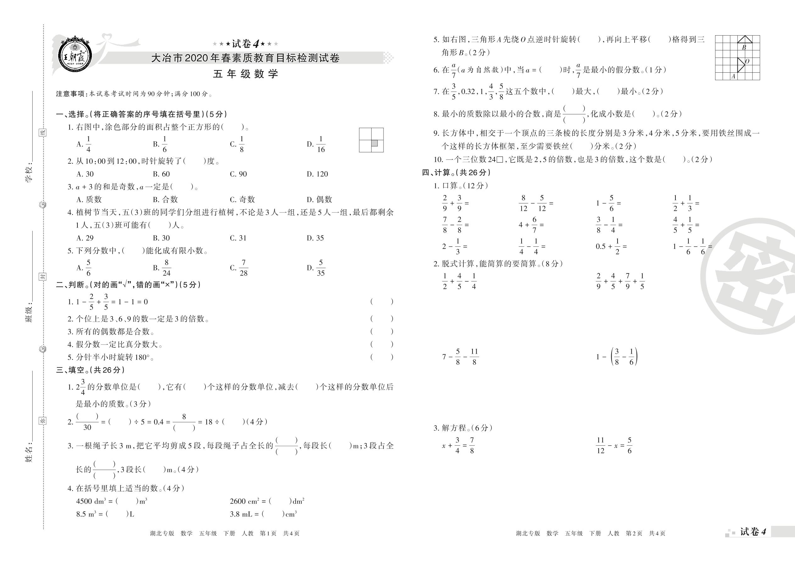 2019-2020学年第二学期大冶市五年级数学试卷(人教版)【4】