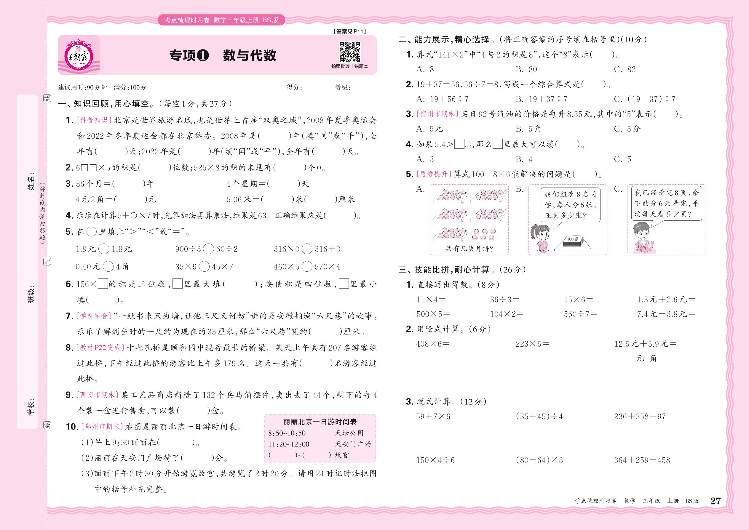 三年级数学北师版上册专项卷
