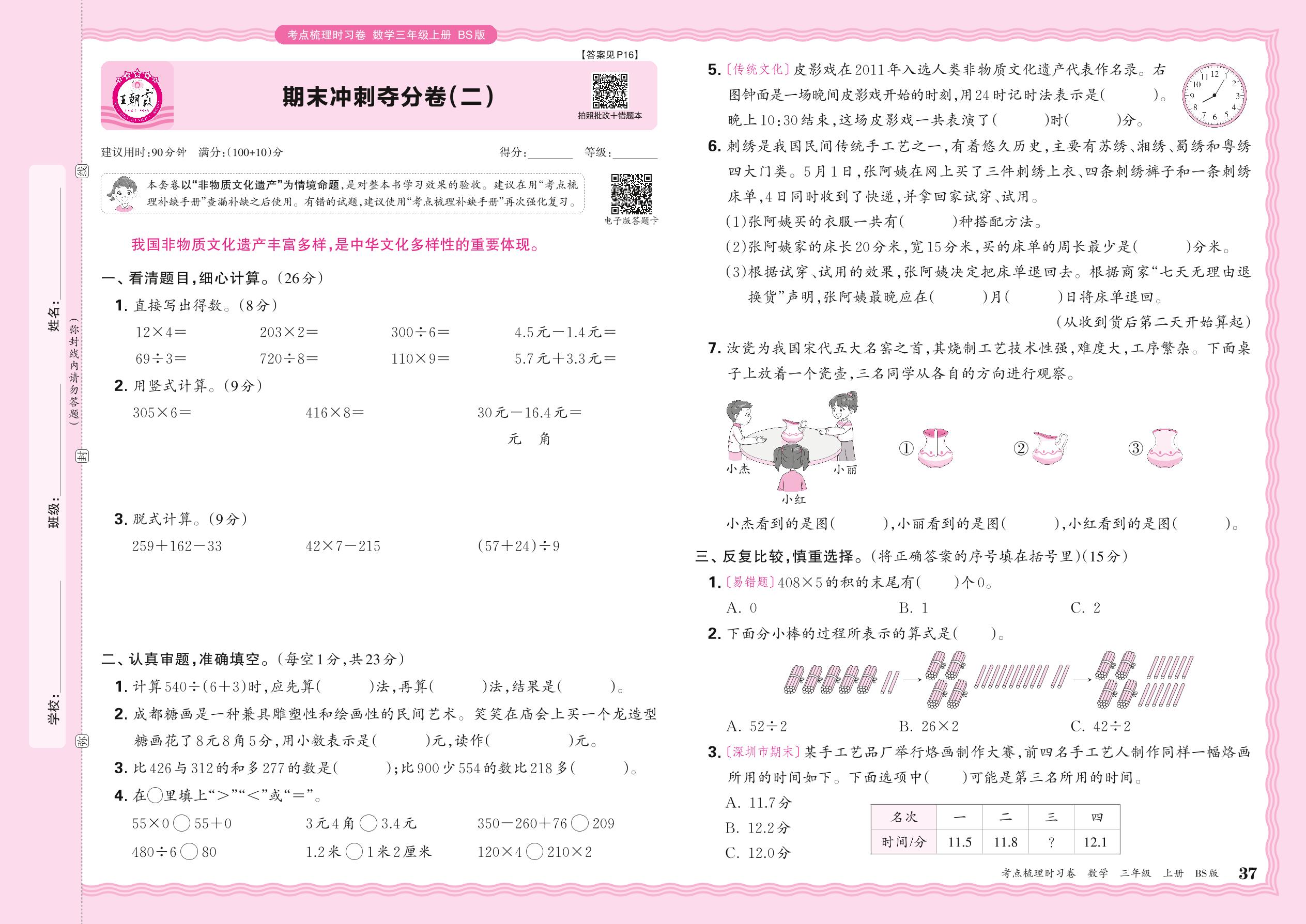 2024秋上册三年级数学北师版 期末冲刺夺分卷(二)