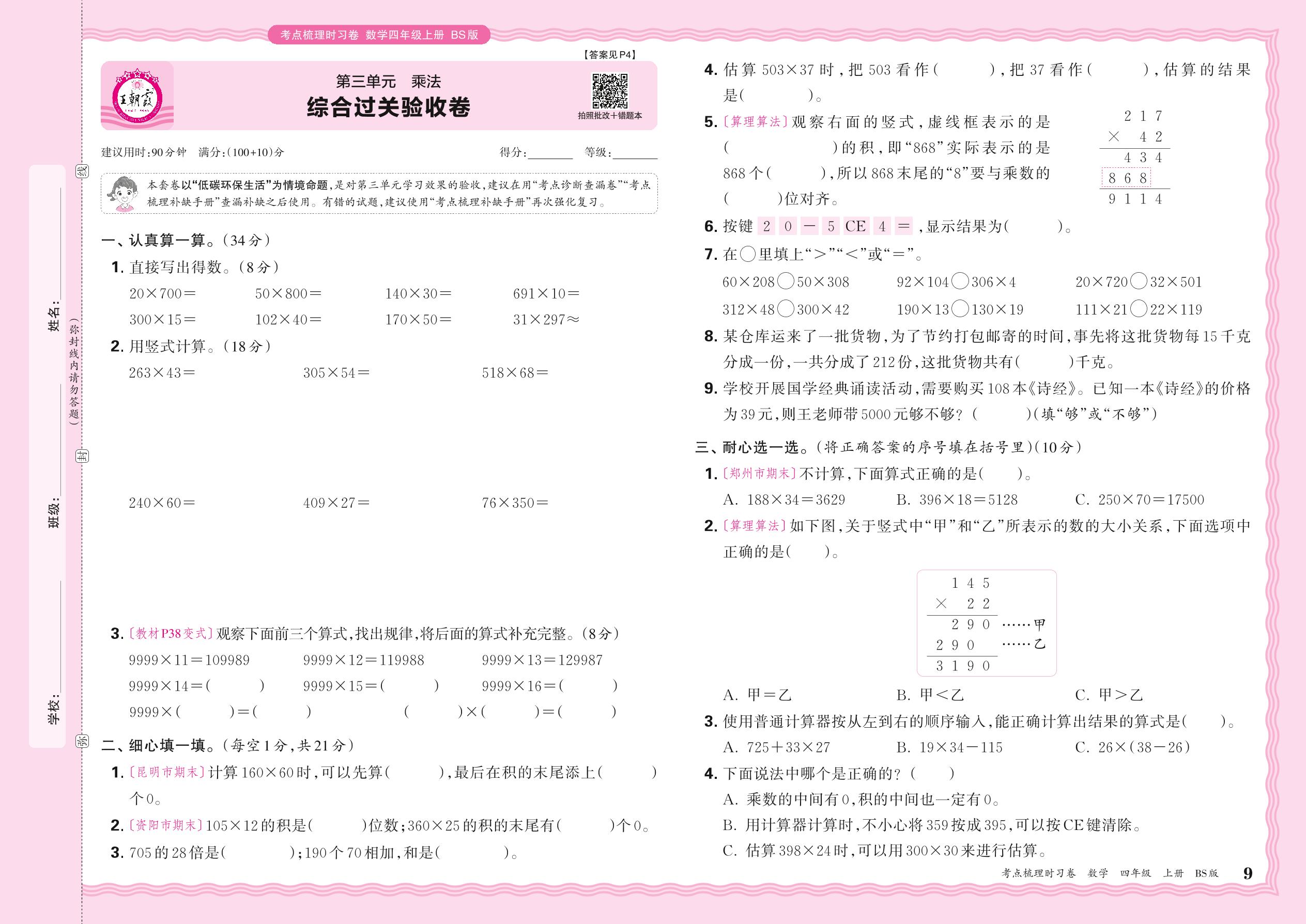 2024秋上册四年级数学北师版 第三单元 综合过关验收卷