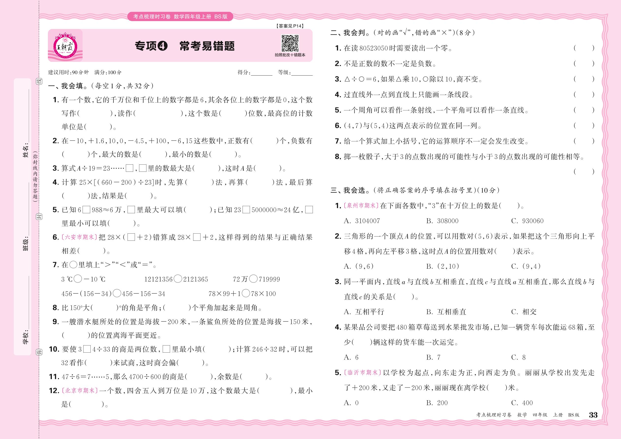 2024秋上册四年级数学北师版 期末专项卷KD版·常考易错题【4】