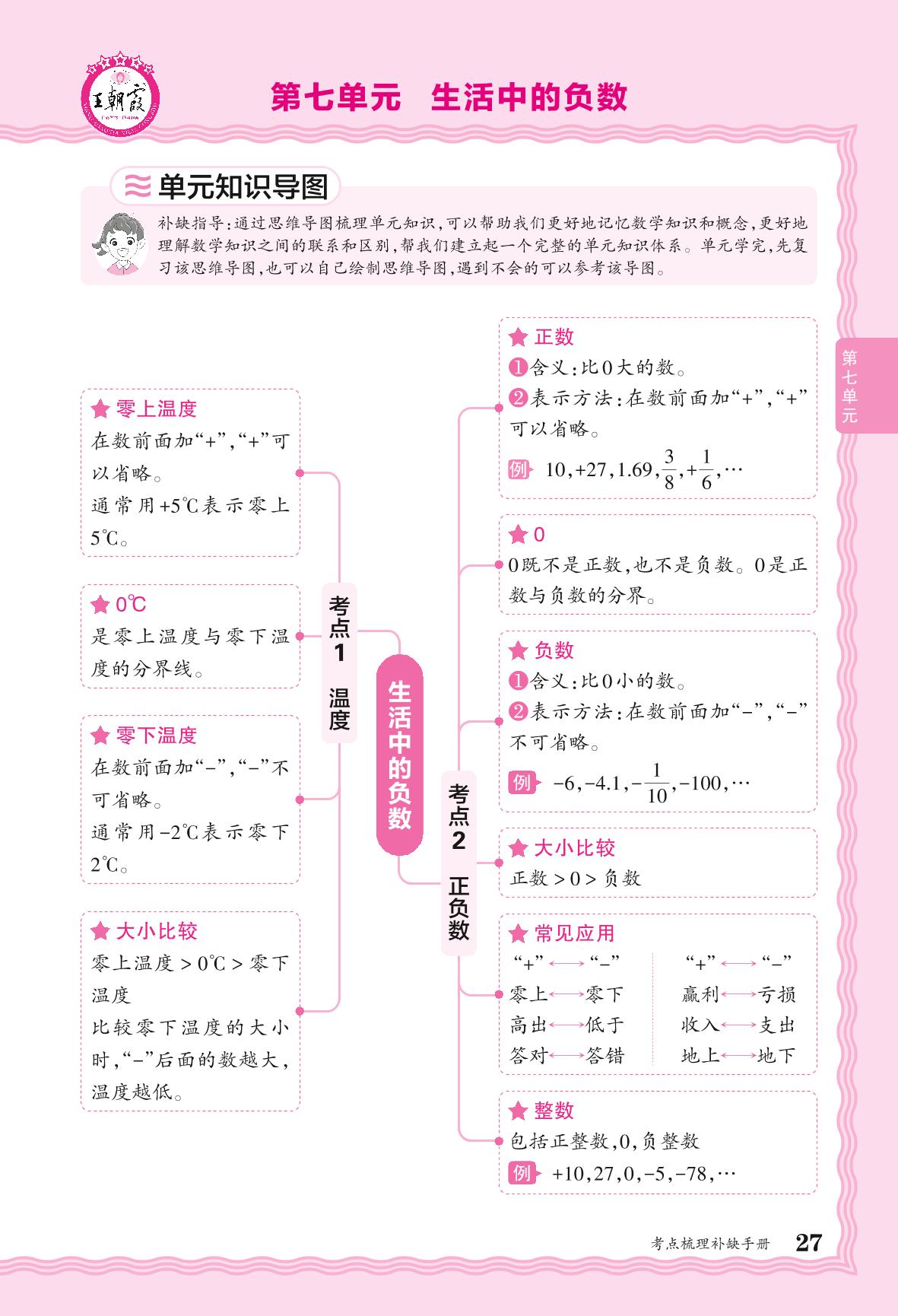 2024秋上册四年级数学北师版 考点梳理补缺手册——第七单元 生活中的负数
