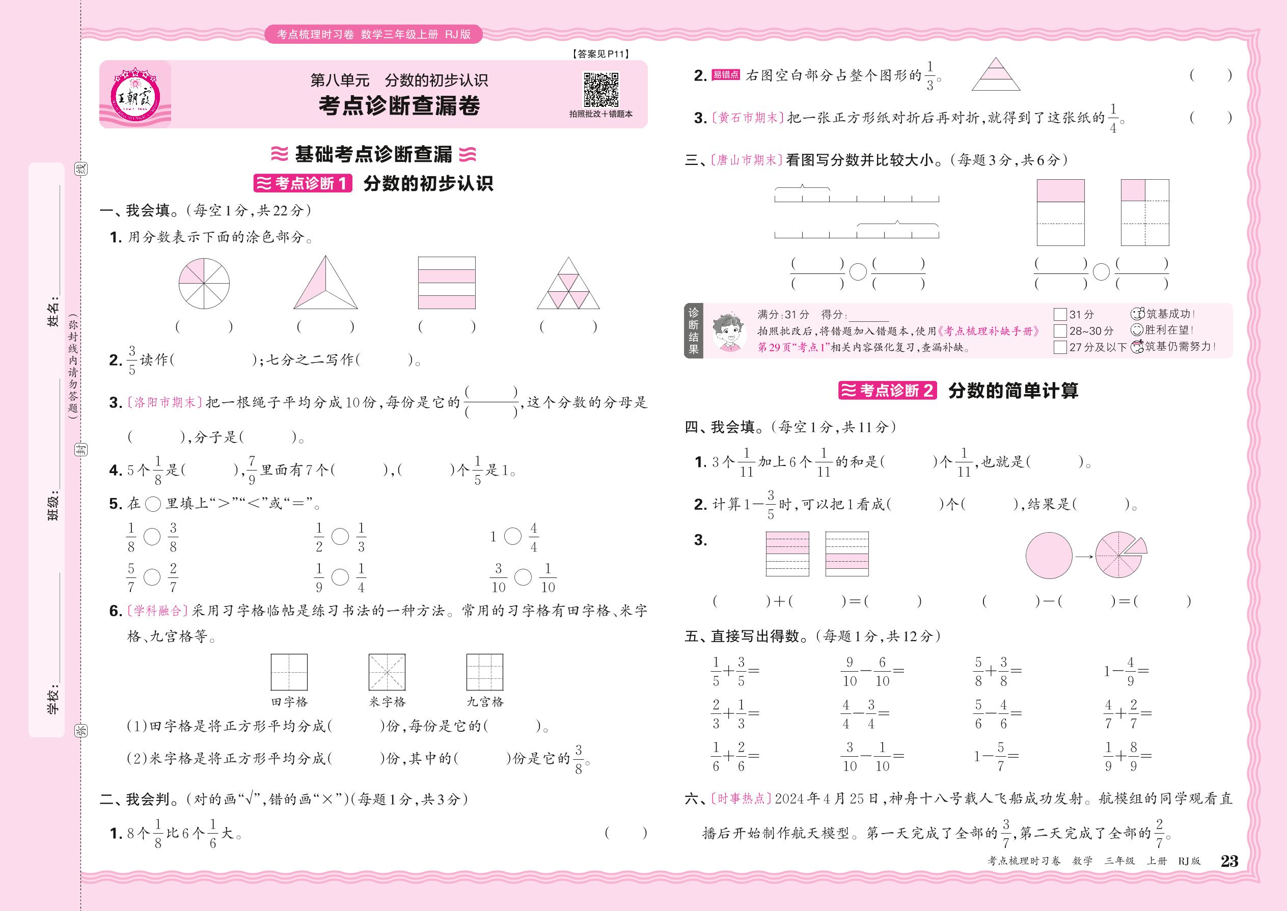 2024秋上册三年级数学人教版 第八单元 考点诊断查漏卷