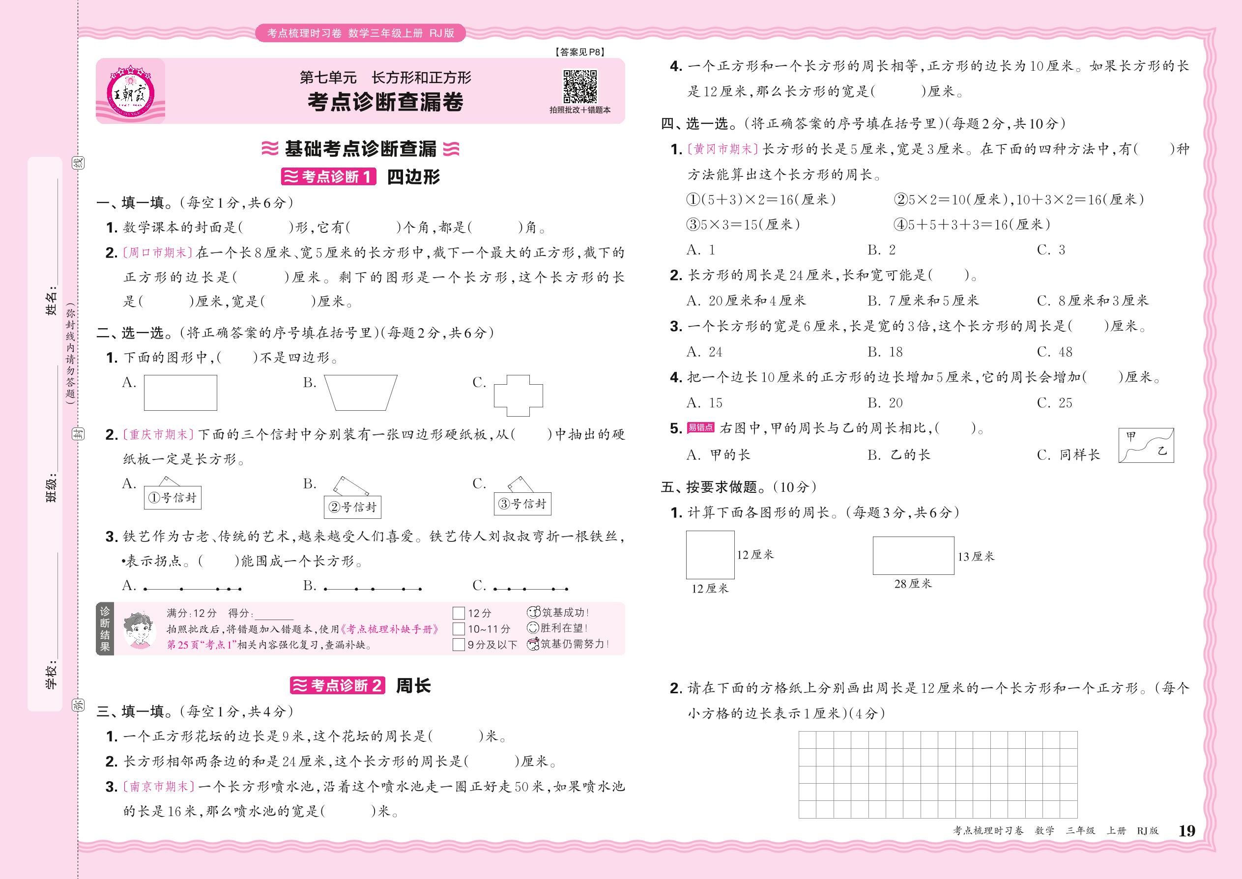 2024秋上册三年级数学人教版 第七单元 考点诊断查漏卷