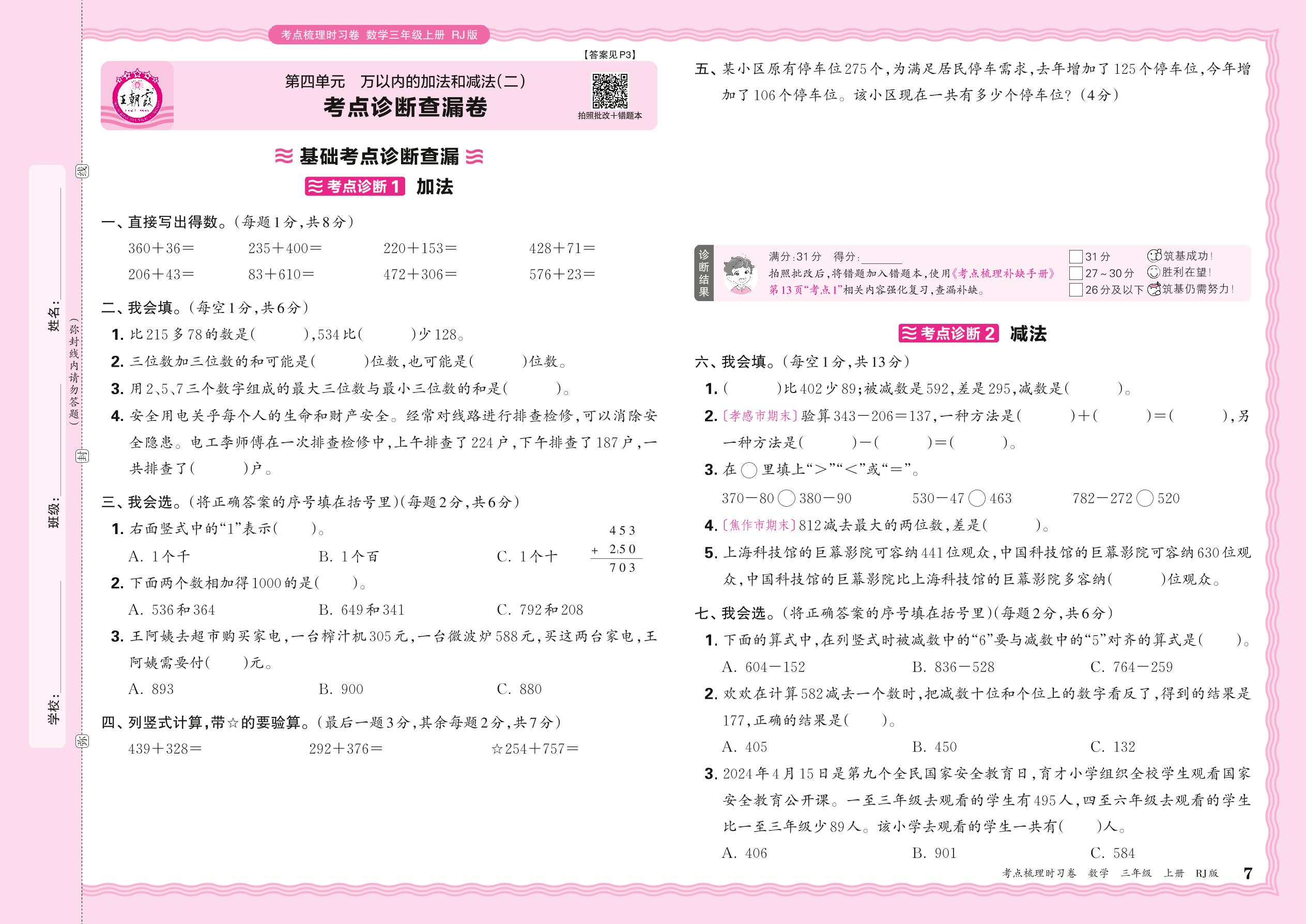 2024秋上册三年级数学人教版 第四单元 考点诊断查漏卷