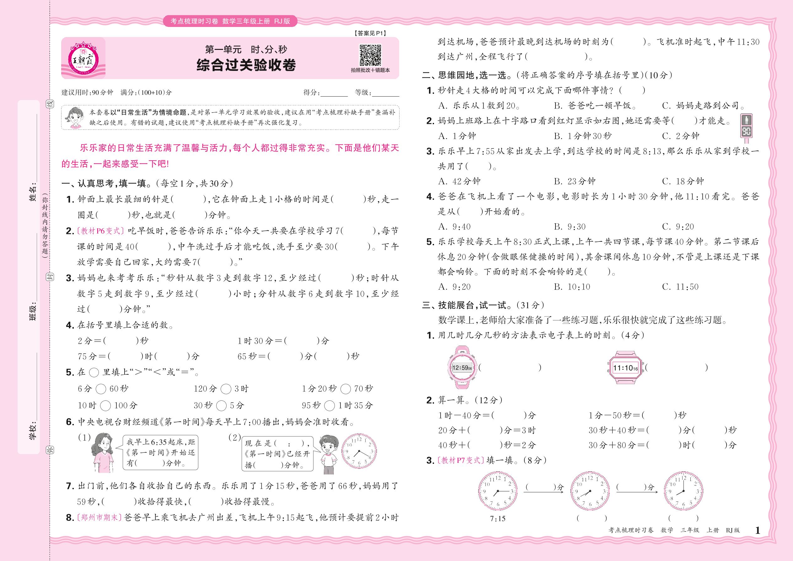 2024秋上册三年级数学人教版 第一单元 综合过关验收卷
