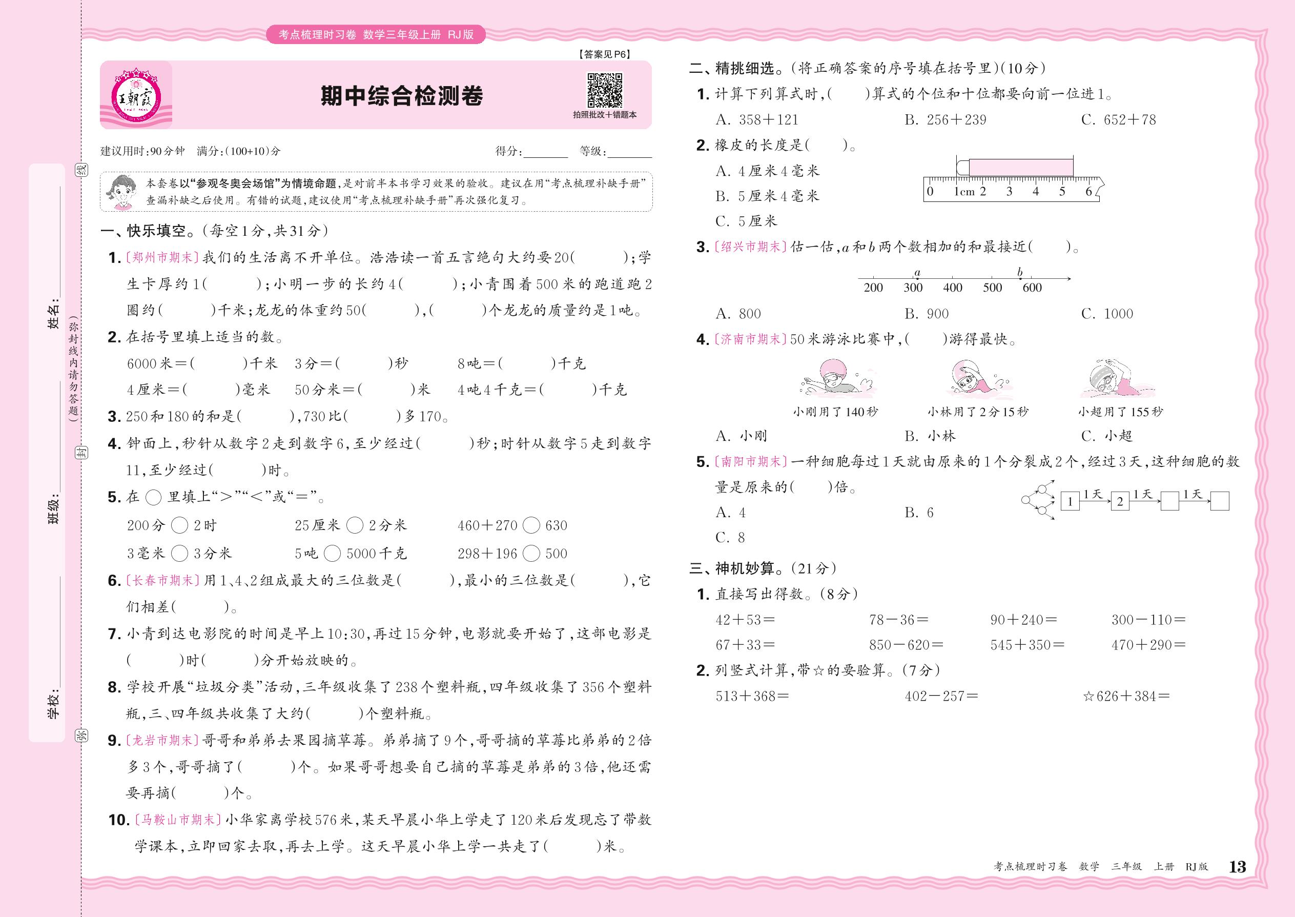 2024秋上册三年级数学人教版 期中综合检测卷