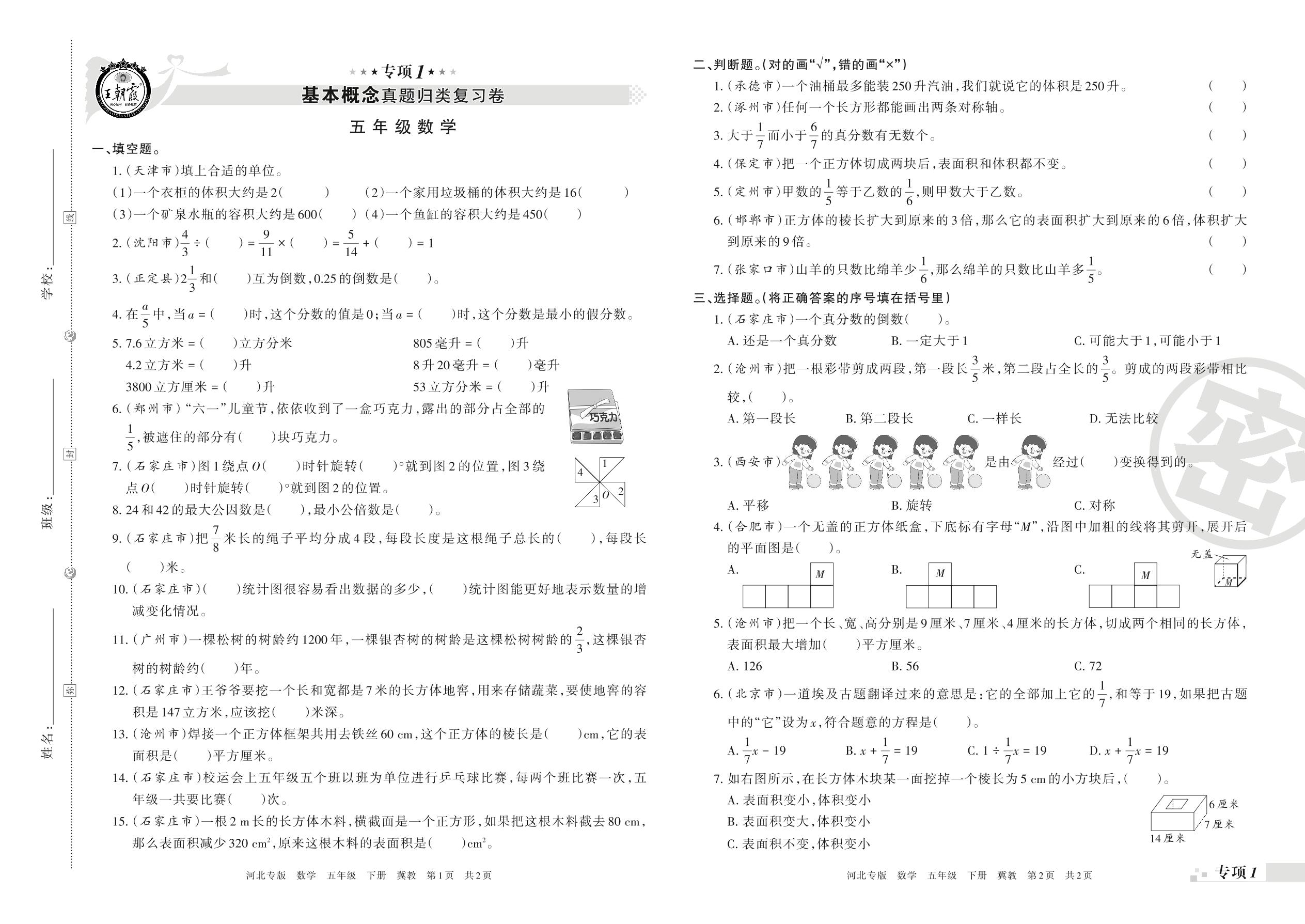 王朝霞期末专项卷——基本概念、计算真题归类复习五年级下册数学(冀教版)【0】