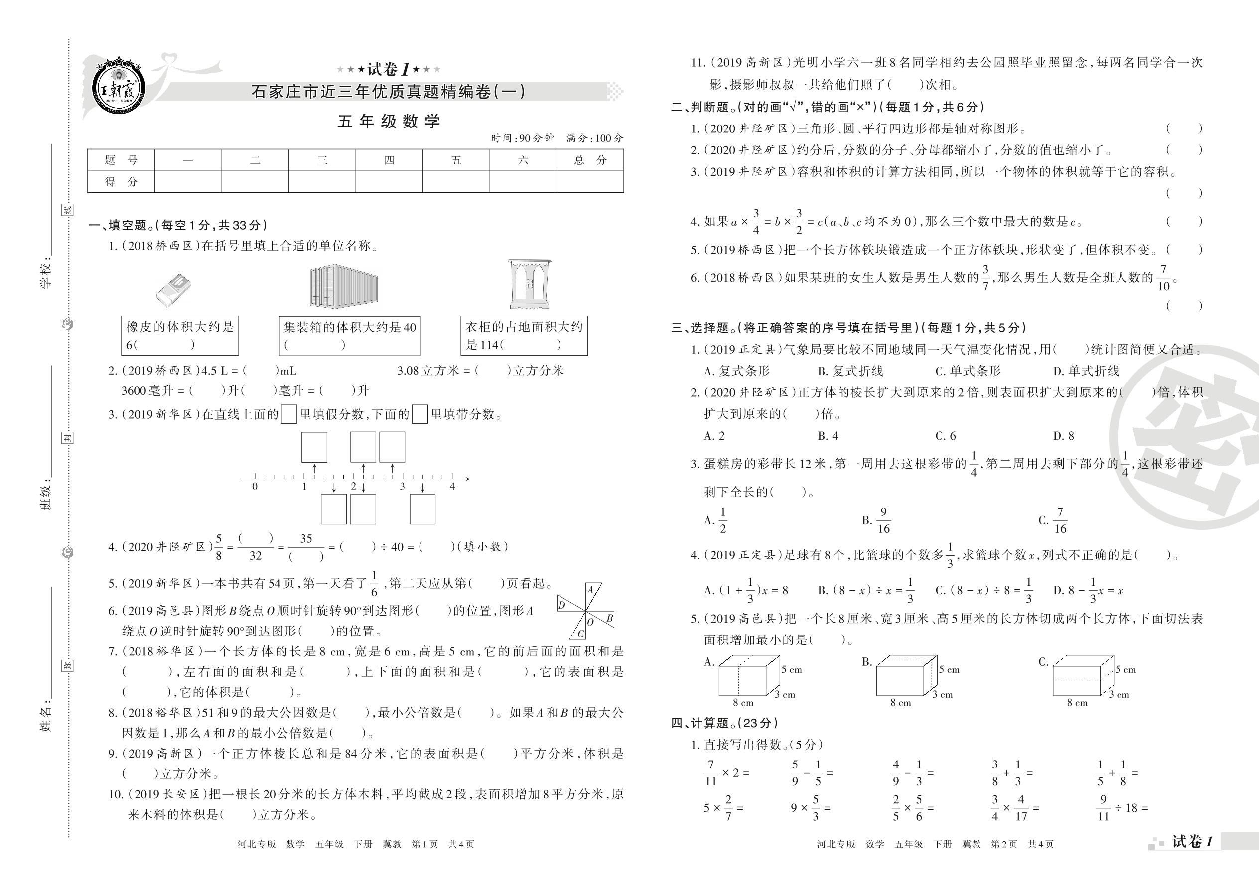 石家庄市近三年优质真题精编卷(一)五年级下册数学(冀教版)【1】
