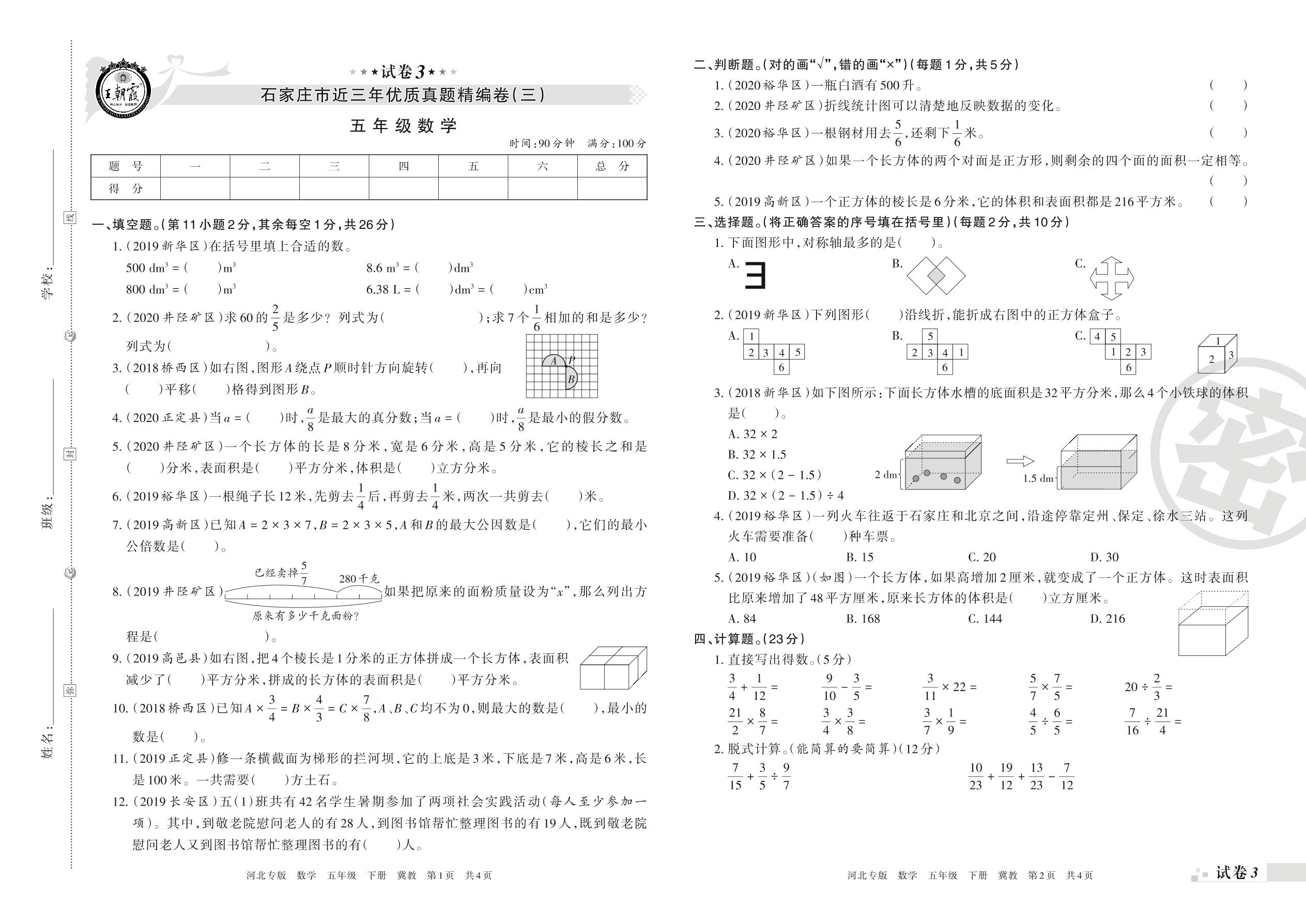 石家庄市近三年优质真题精编卷(三)五年级下册数学(冀教版)【3】