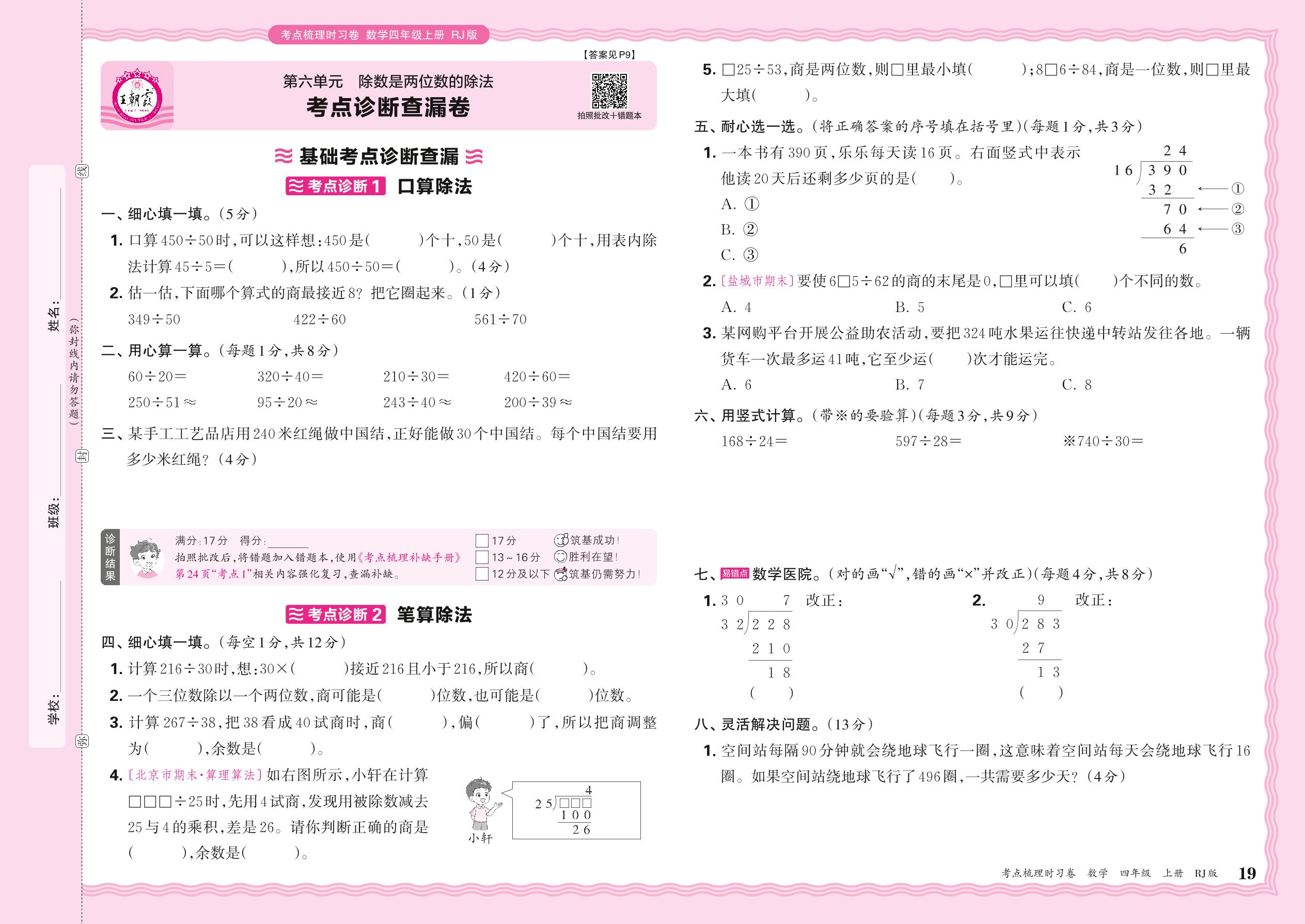 2024秋上册四年级数学人教版 第六单元 考点诊断查漏卷