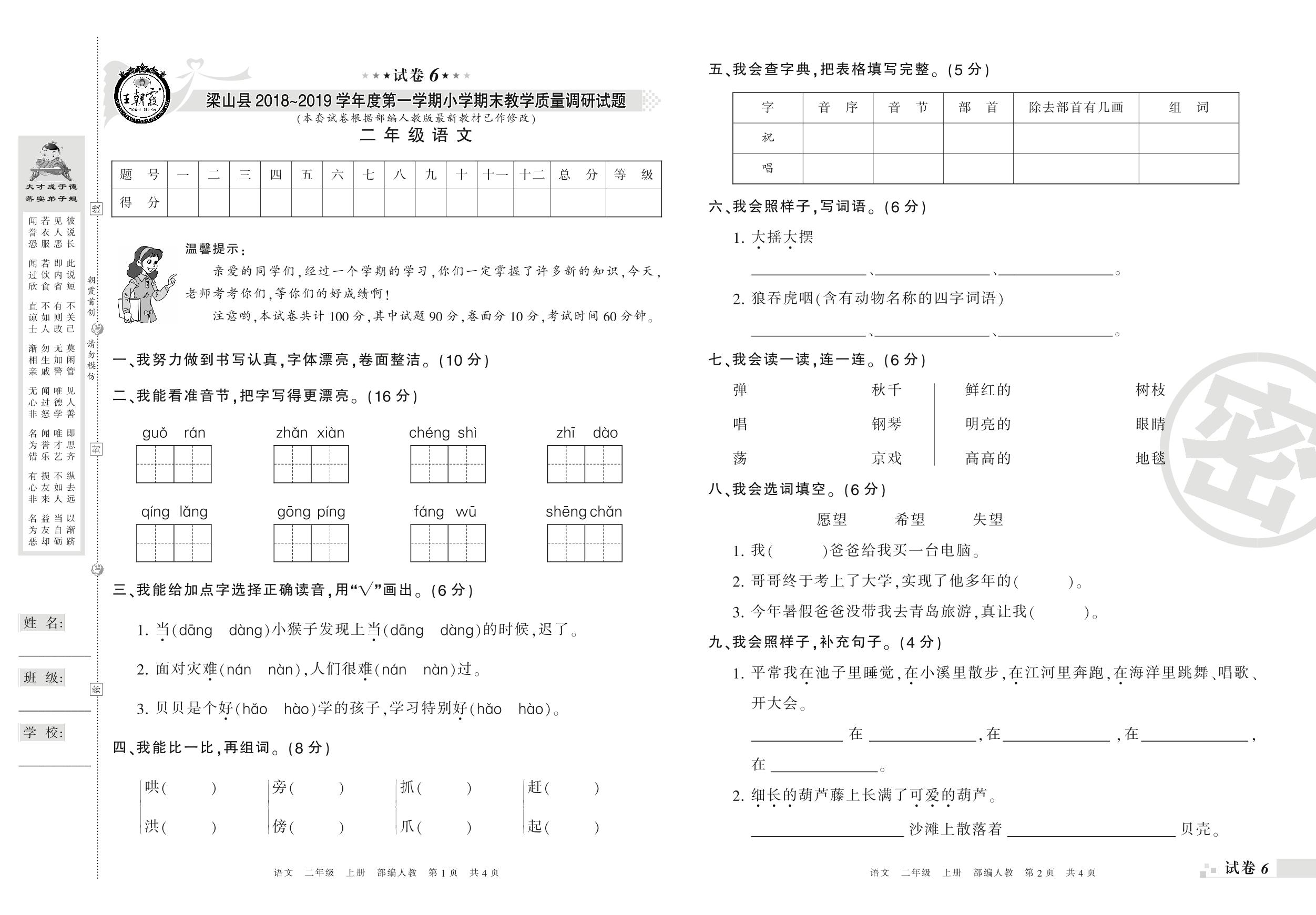 2018-2019学年第一学期济宁市梁山县二年级语文试卷(人教版)【6】