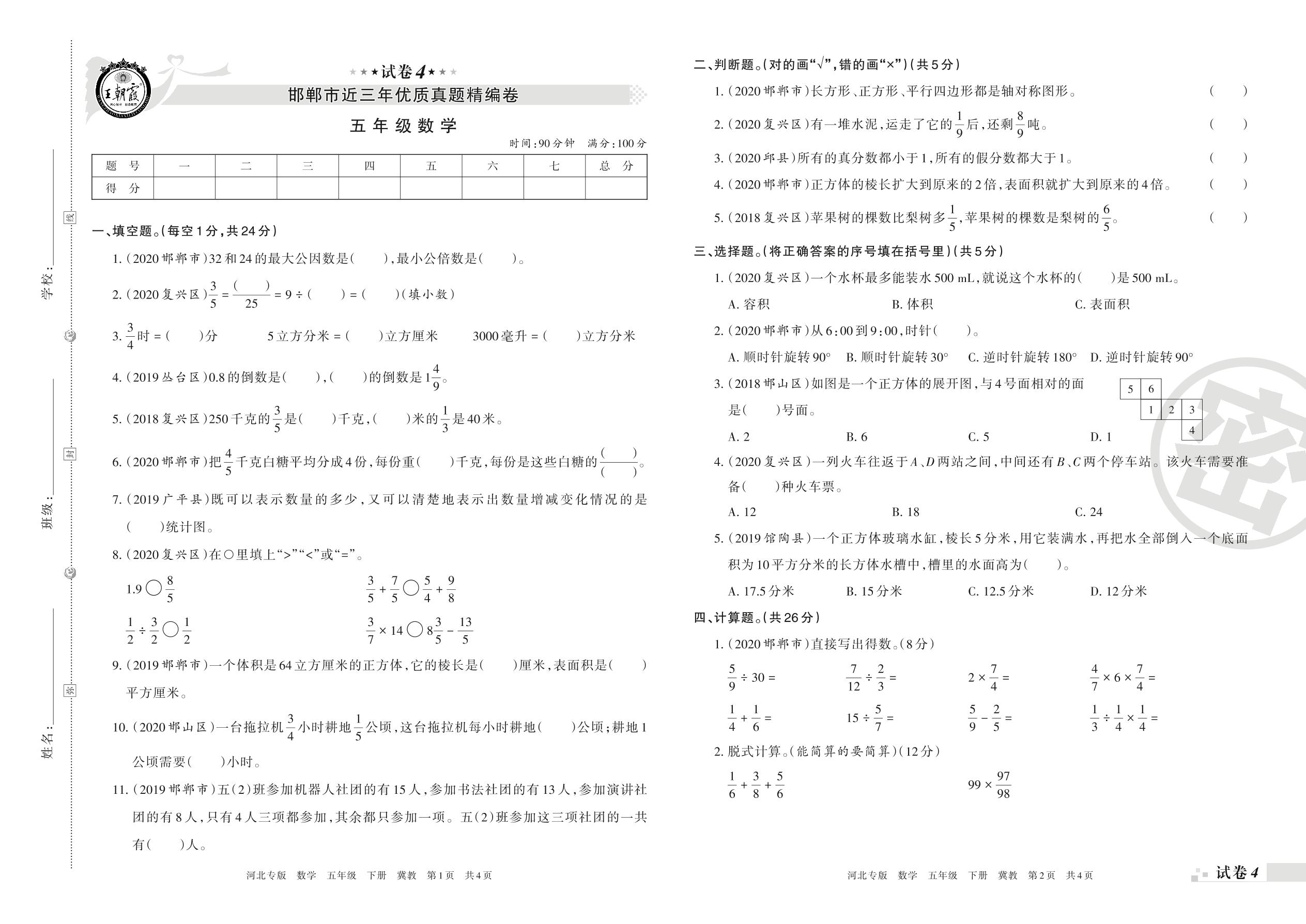 邯郸市近三年优质真题精编卷五年级下册数学(冀教版)【4】
