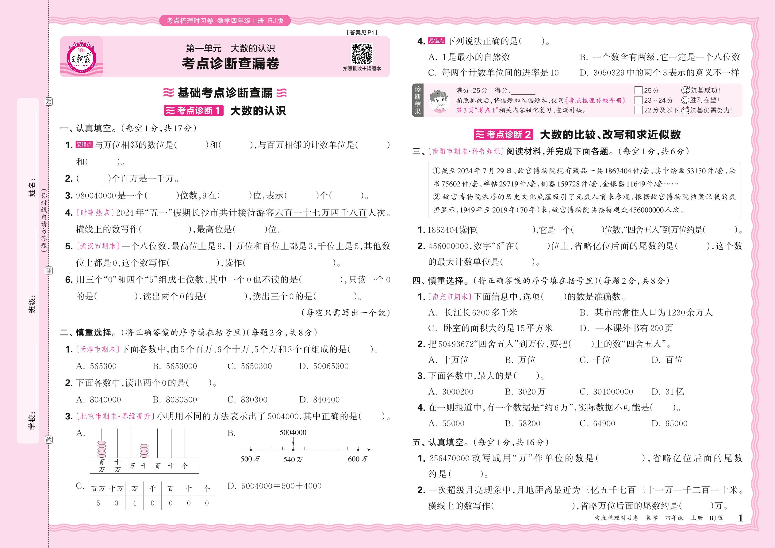 2024秋上册四年级数学人教版 第一单元 考点诊断查漏卷
