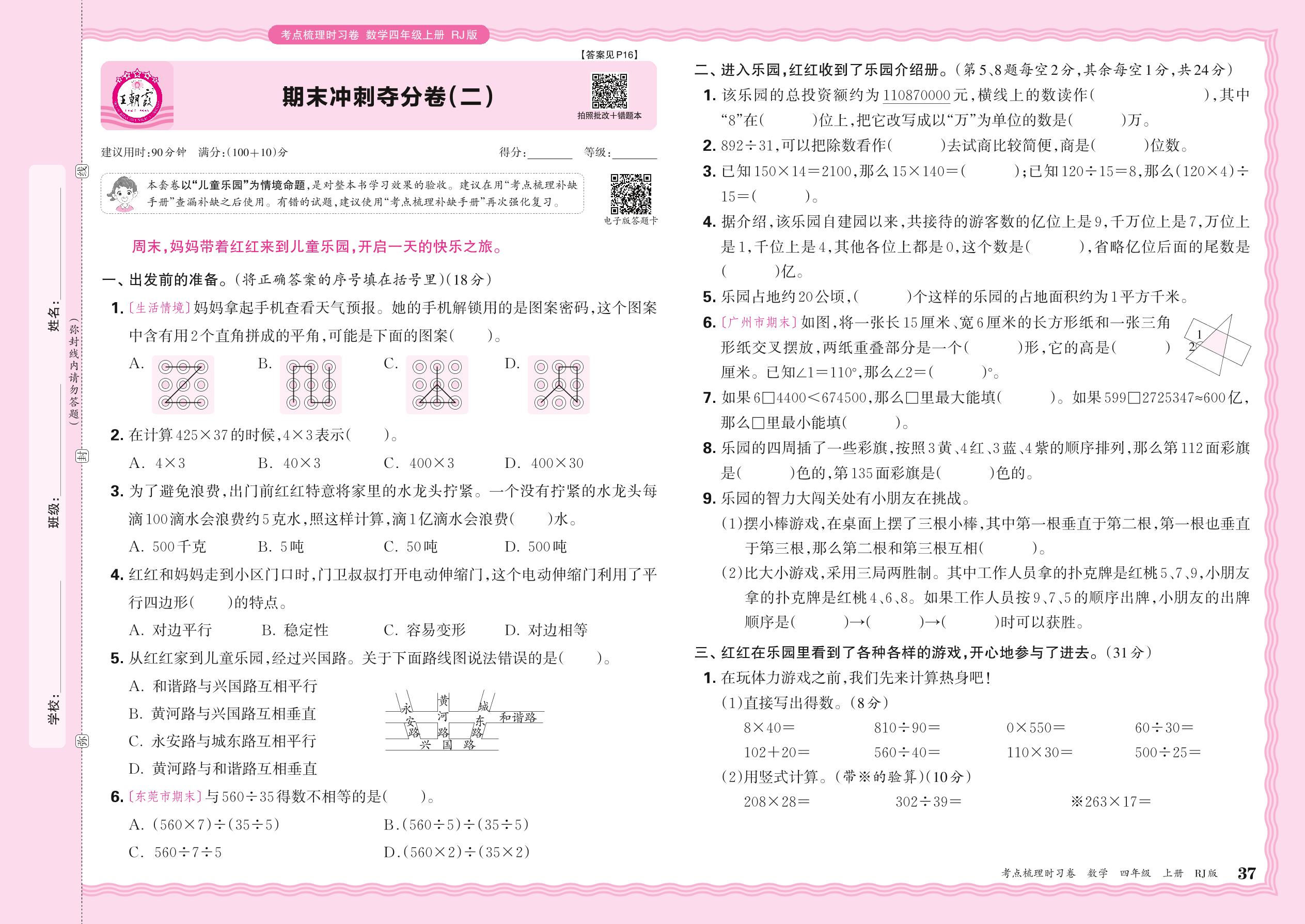 2024秋上册四年级数学人教版 期末冲刺夺分卷(二)