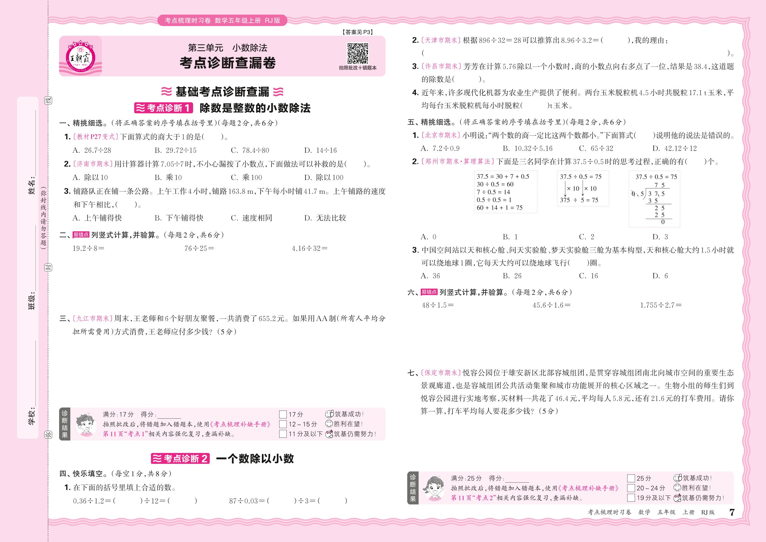 2024秋上册五年级数学人教版 第三单元 考点诊断查漏卷