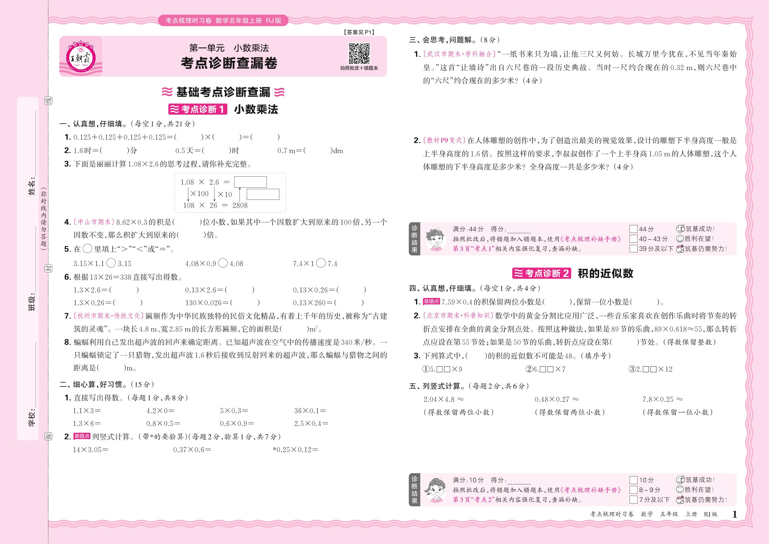 2024秋上册五年级数学人教版 第一单元 考点诊断查漏卷