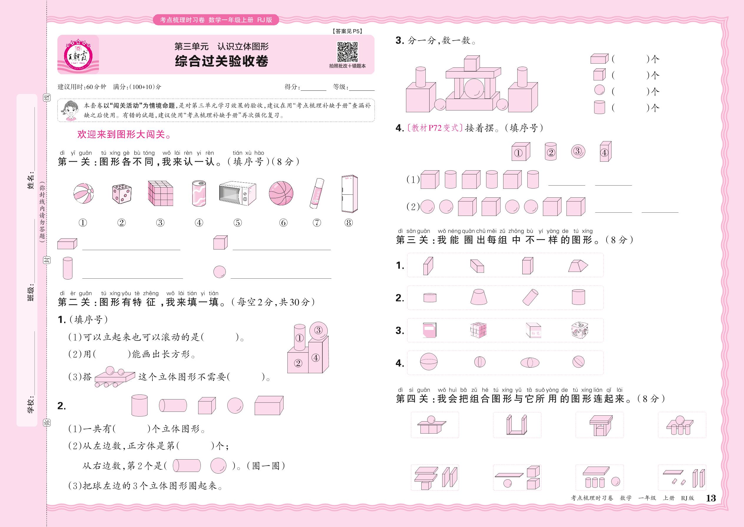2024秋上册一年级数学人教版 第三单元 综合过关验收卷