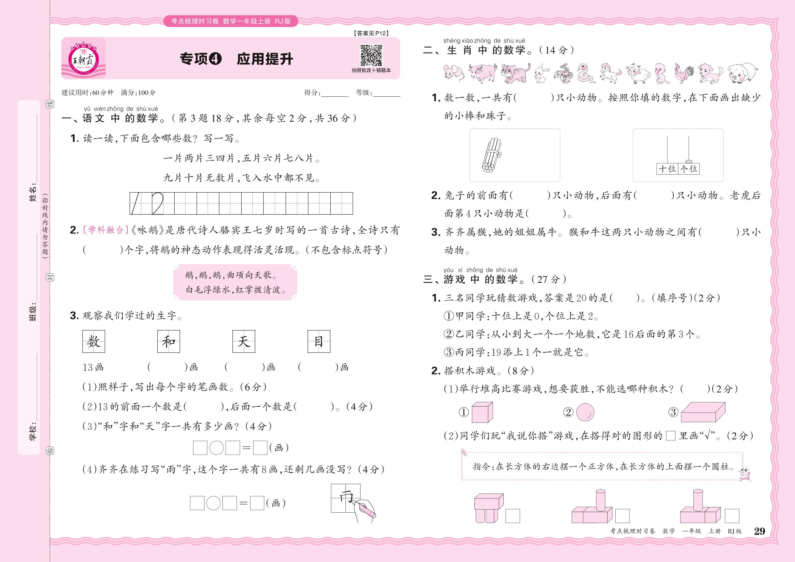 一年级数学人教版(2024)上册专项卷