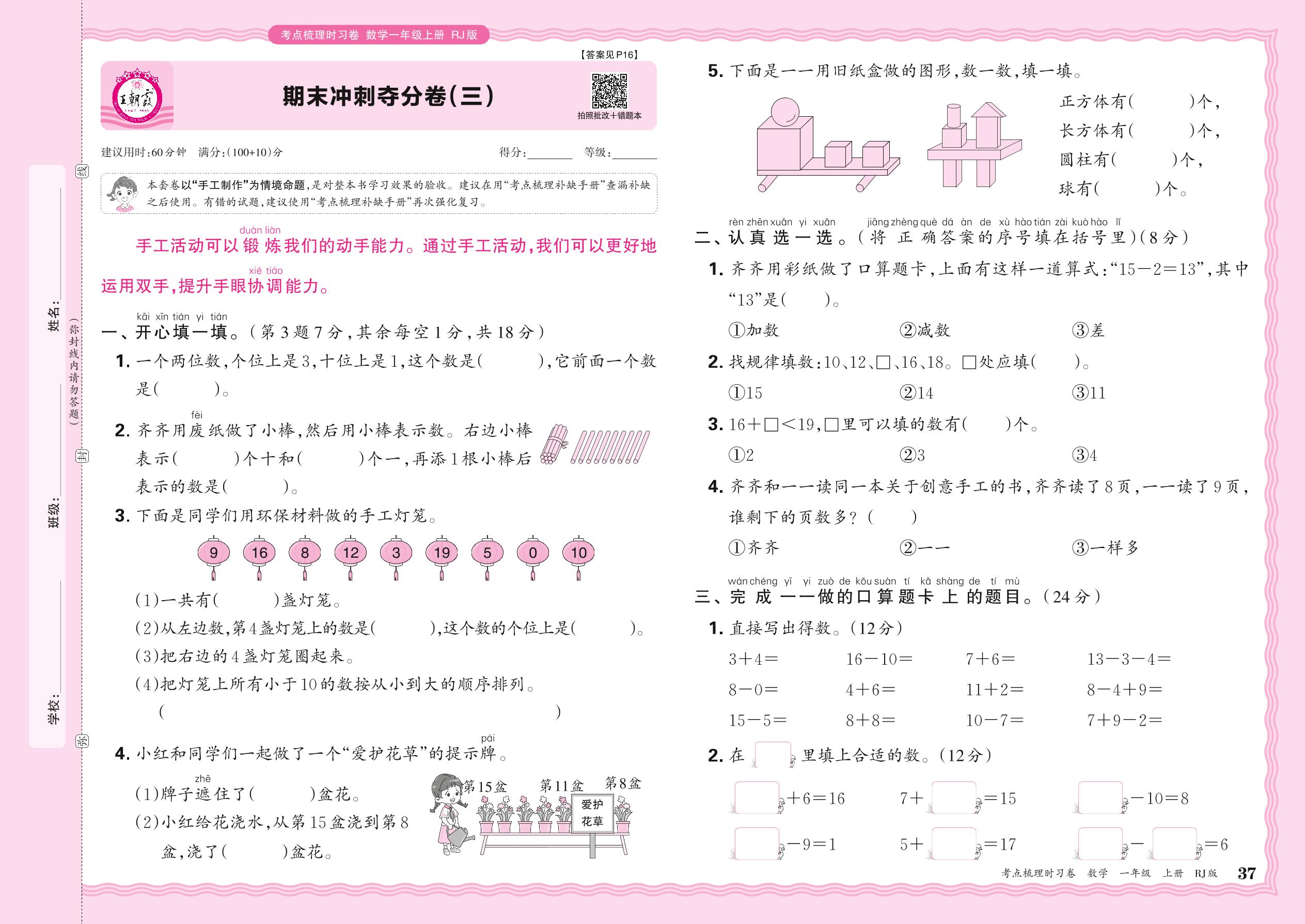 2024秋上册一年级数学人教版 期末冲刺夺分卷(三)