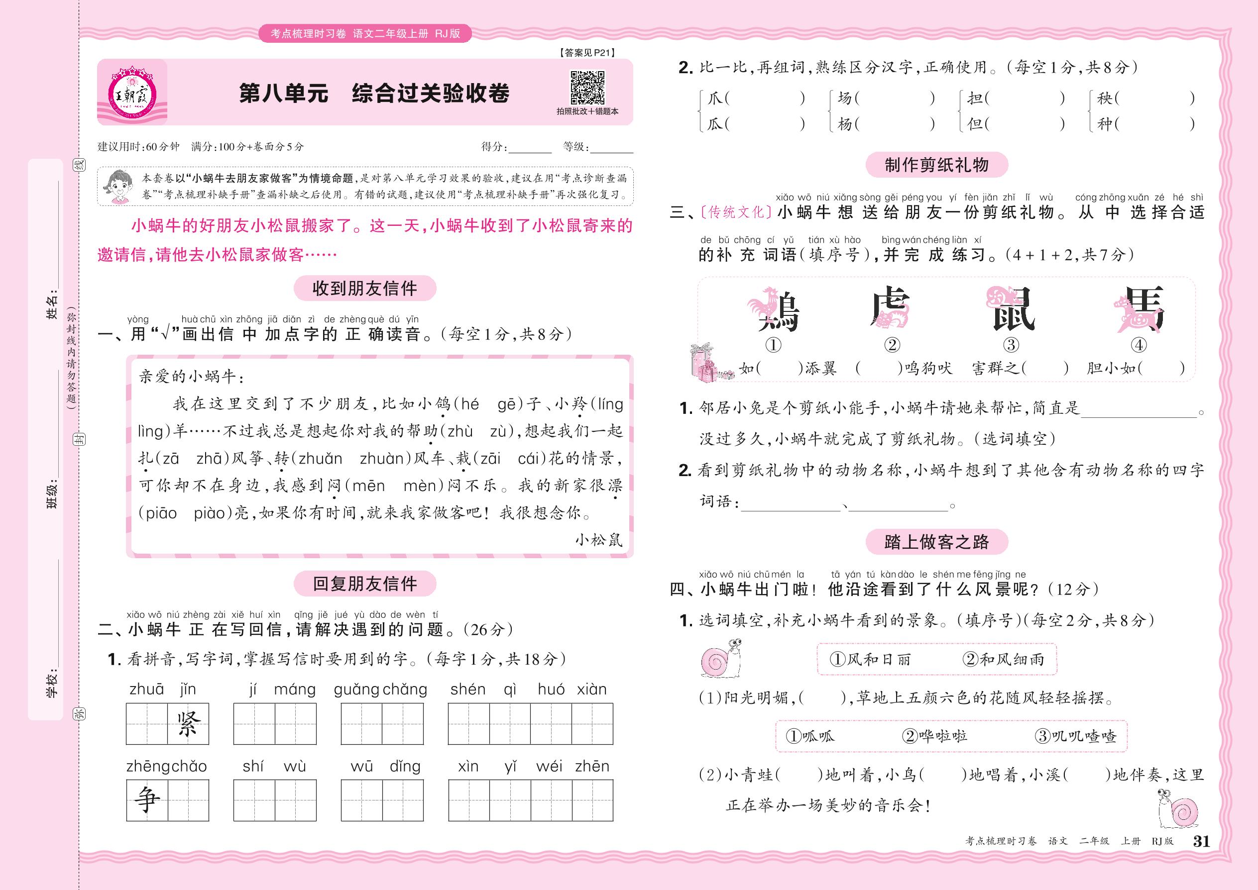 2024秋上册二年级语文人教版 第八单元 综合过关验收卷
