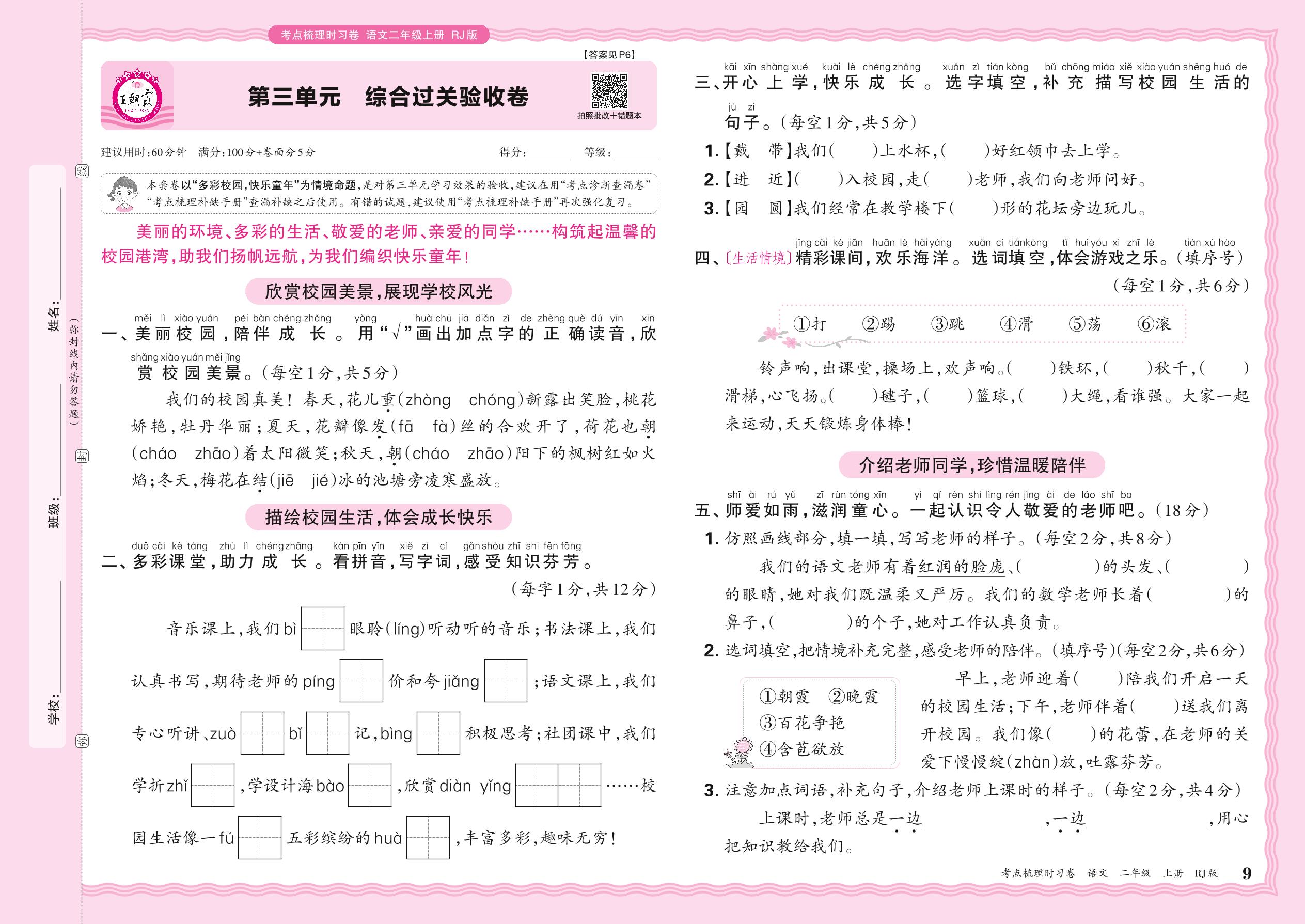 2024秋上册二年级语文人教版 第三单元 综合过关验收卷
