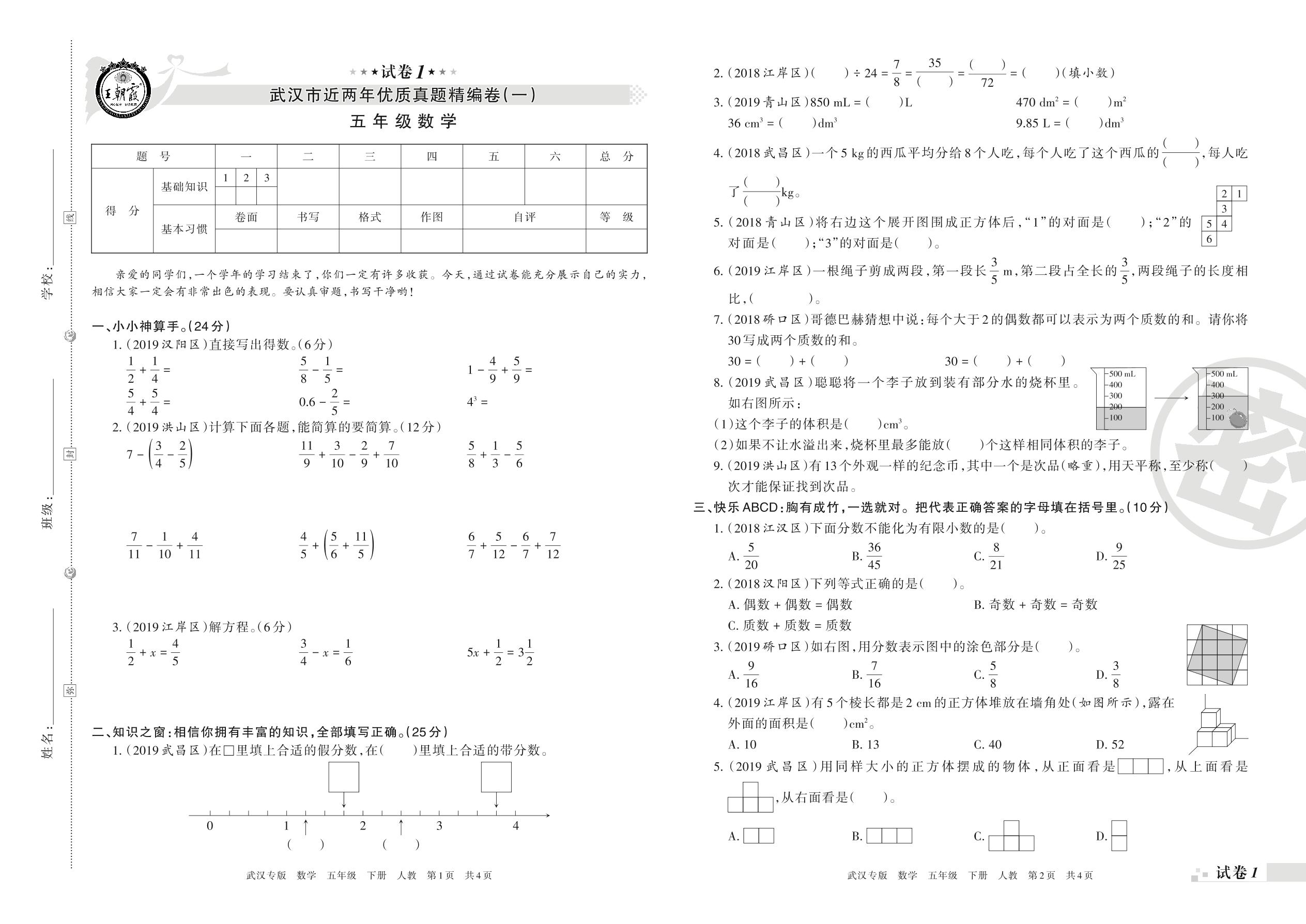武汉市近两年优质真题精编卷(一)五年级下册数学(人教版)【1】