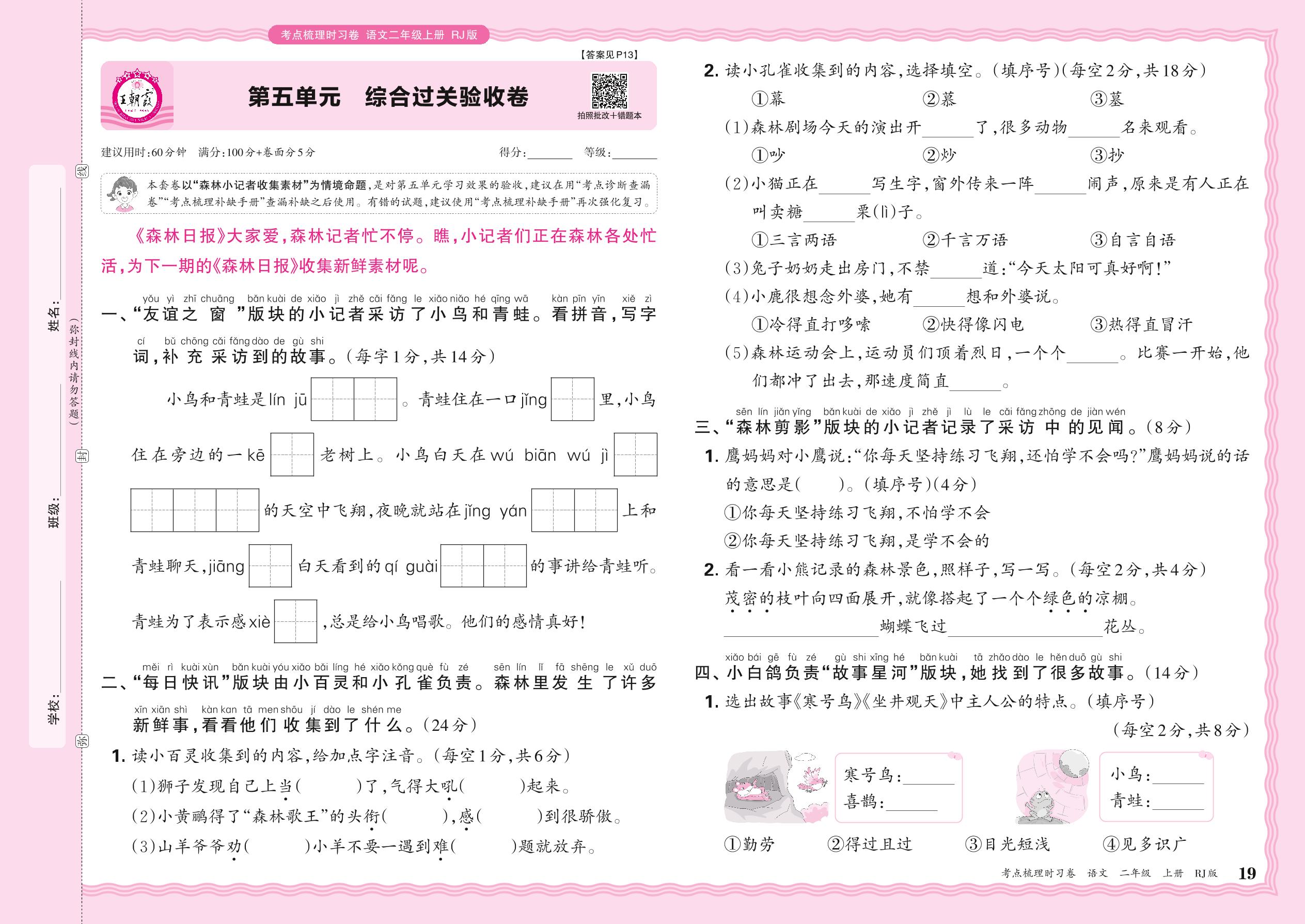 2024秋上册二年级语文人教版 第五单元 综合过关验收卷