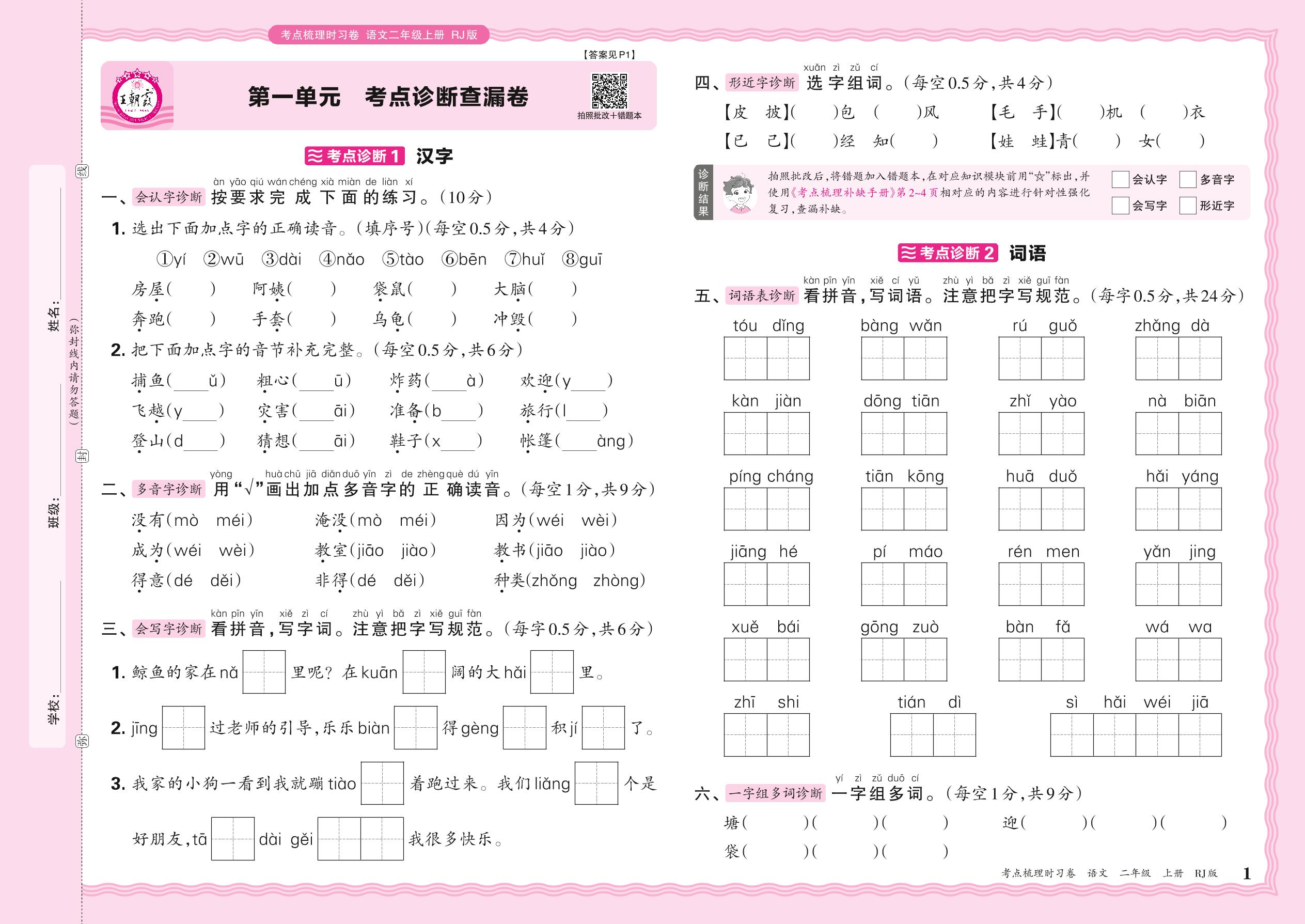 2024秋上册二年级语文人教版 第一单元 考点诊断查漏卷