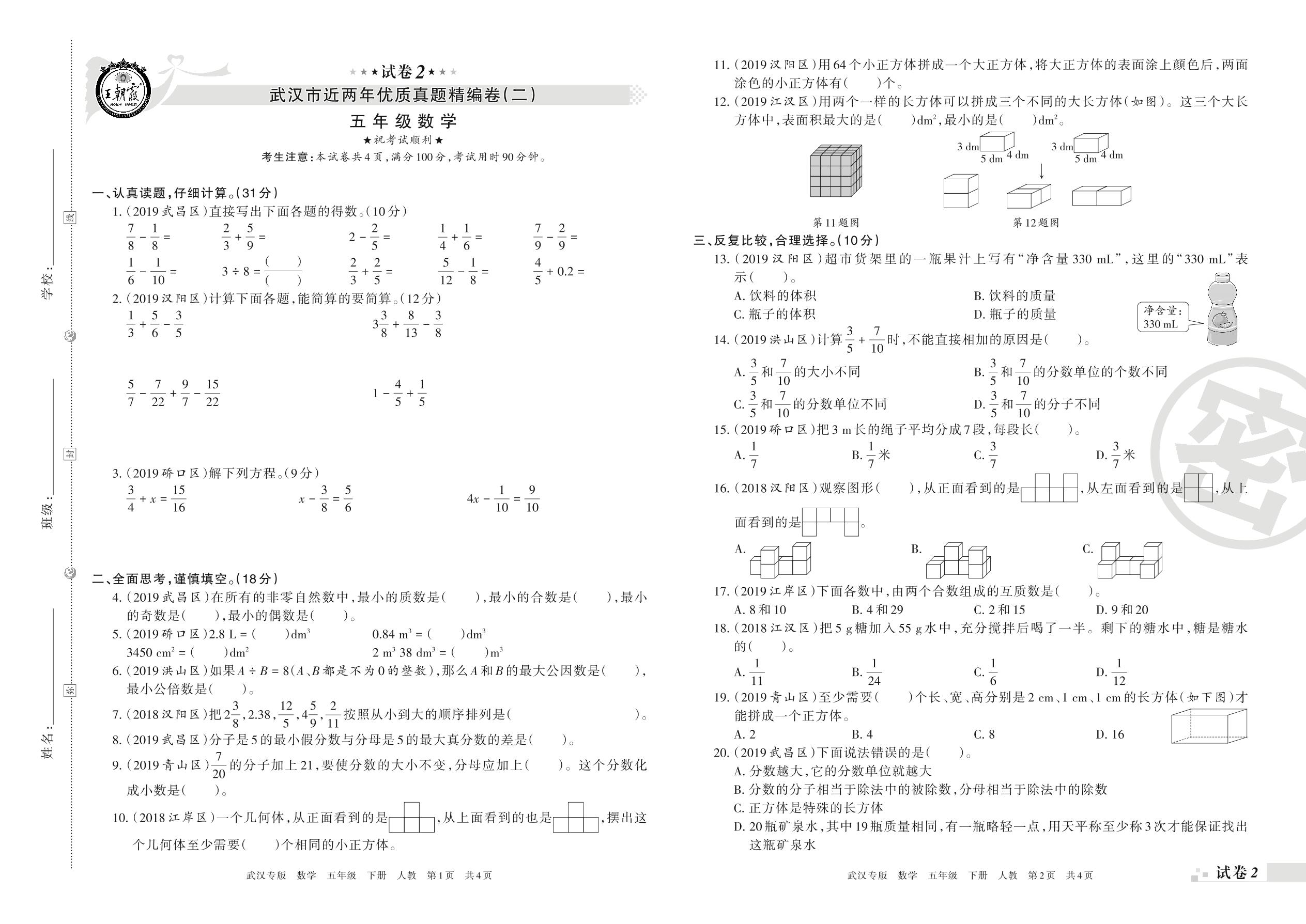 武汉市近两年优质真题精编卷(二)五年级下册数学(人教版)【2】