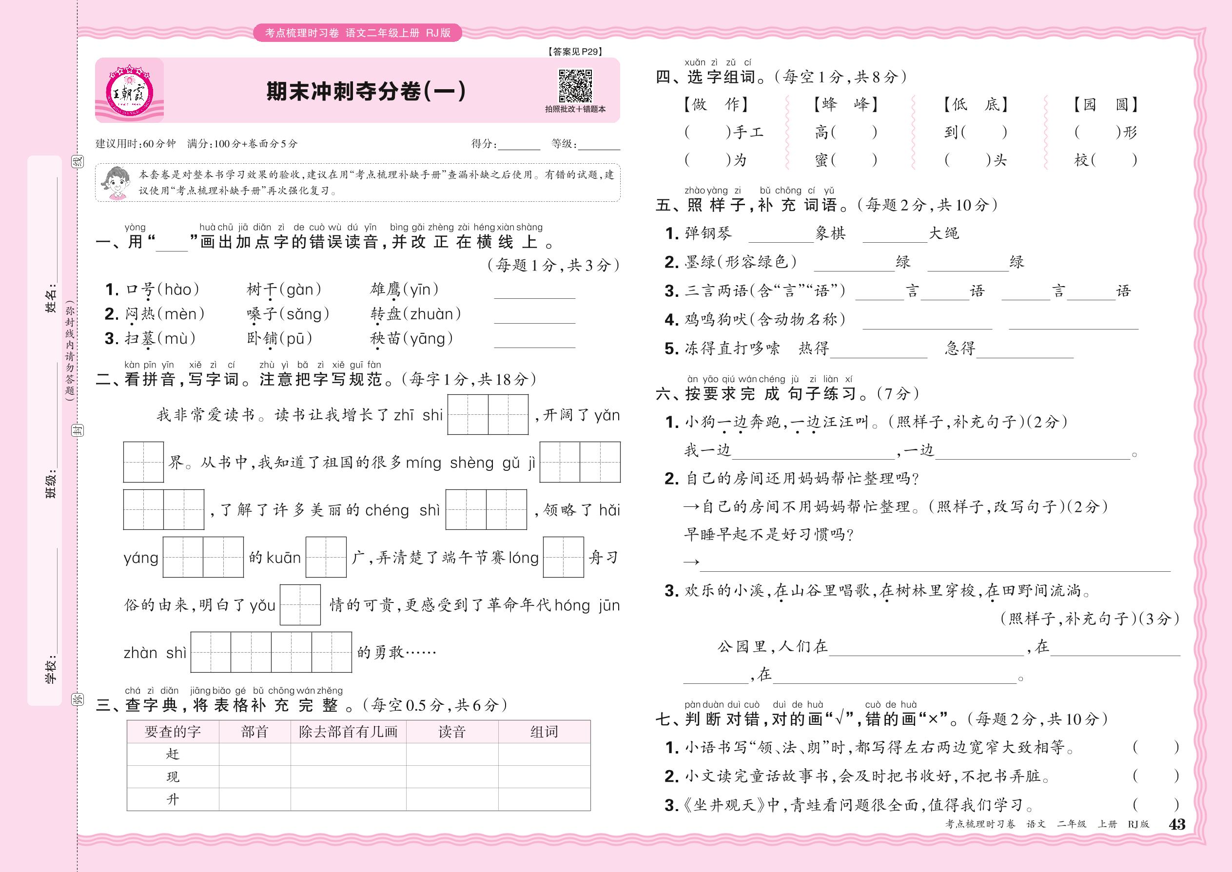 2024秋上册二年级语文人教版 期末冲刺夺分卷(一)