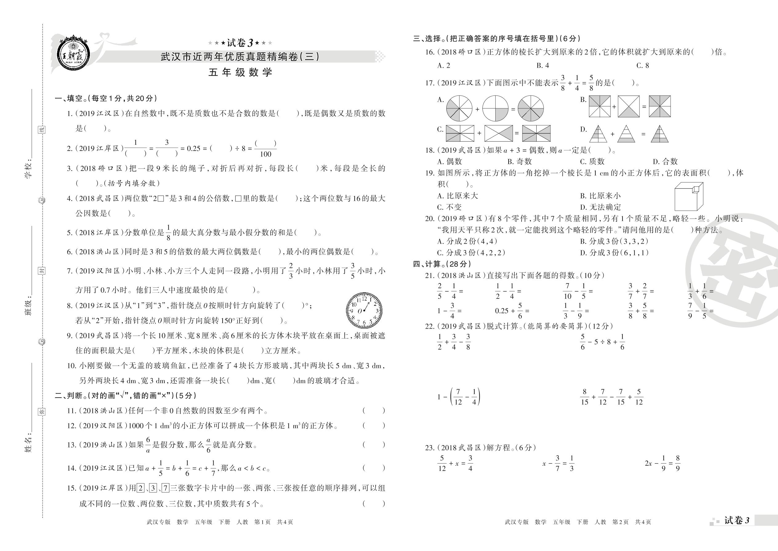武汉市近两年优质真题精编卷(三)五年级下册数学(人教版)【3】