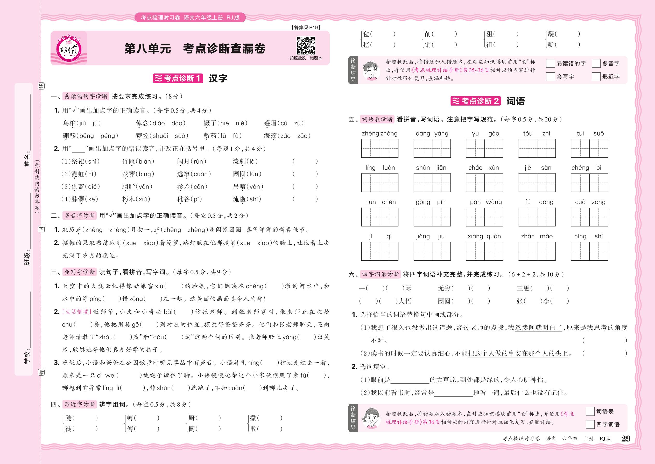 2024秋上册六年级语文人教版 第八单元 考点诊断查漏卷