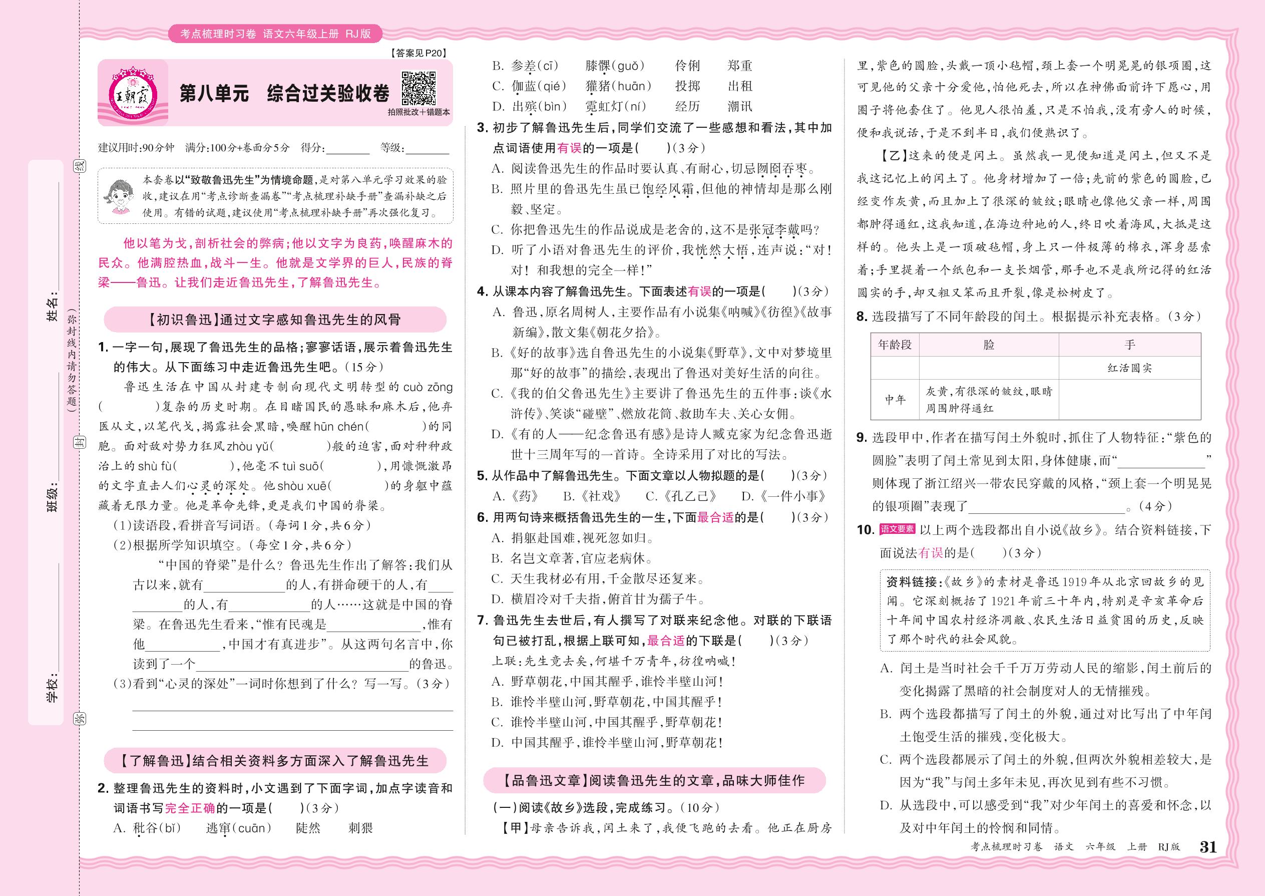 2024秋上册六年级语文人教版 第八单元 综合过关验收卷