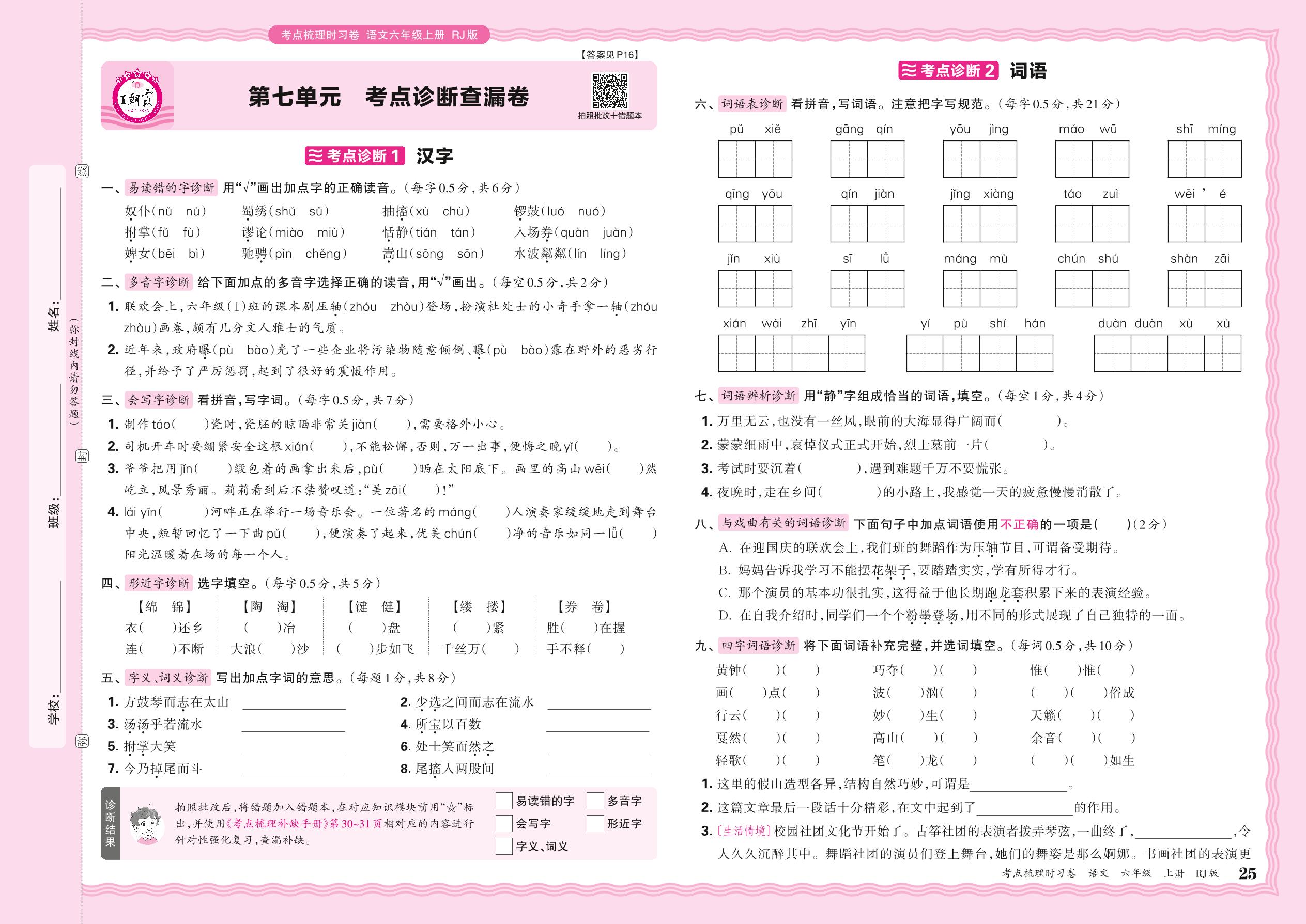 2024秋上册六年级语文人教版 第七单元 考点诊断查漏卷