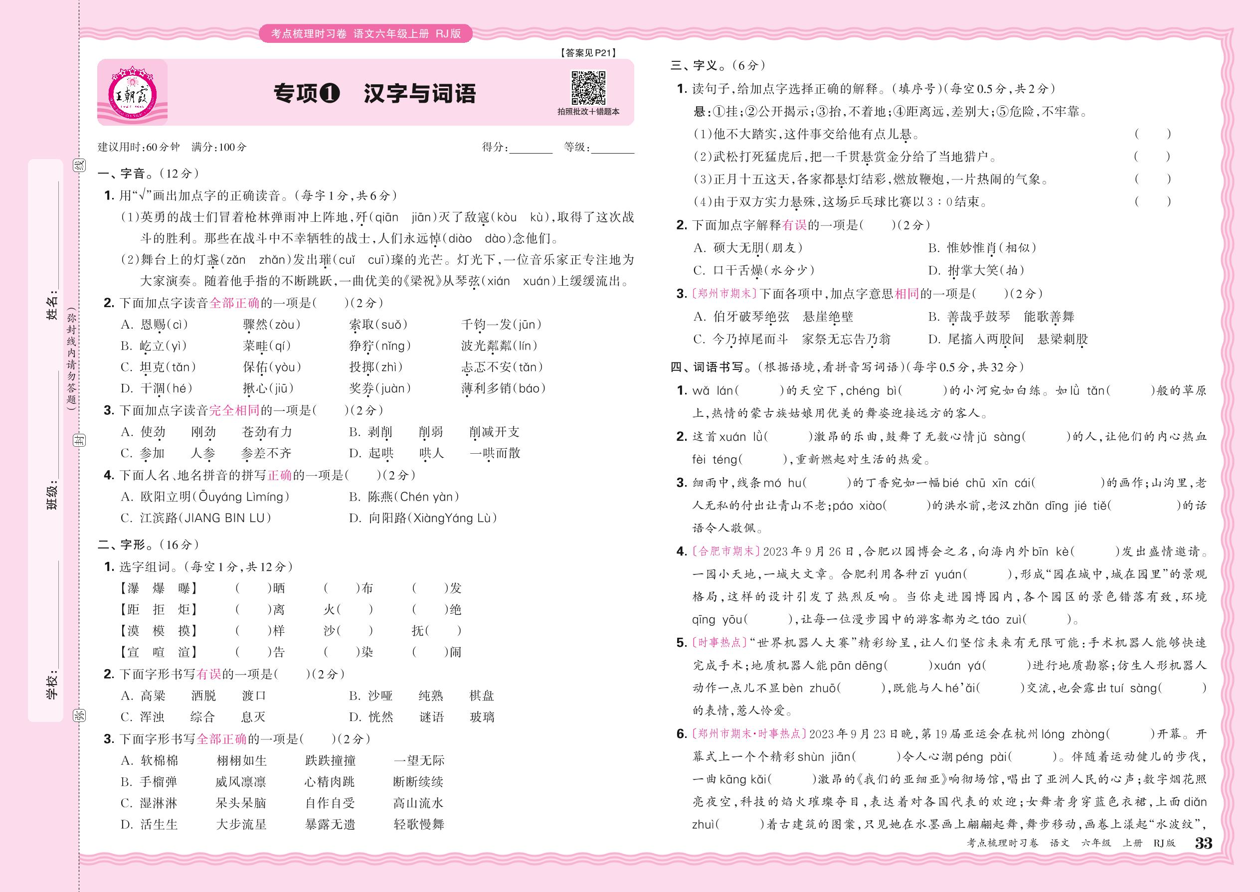 2024秋上册六年级语文人教版 期末专项卷KD版·汉字与词语【1】