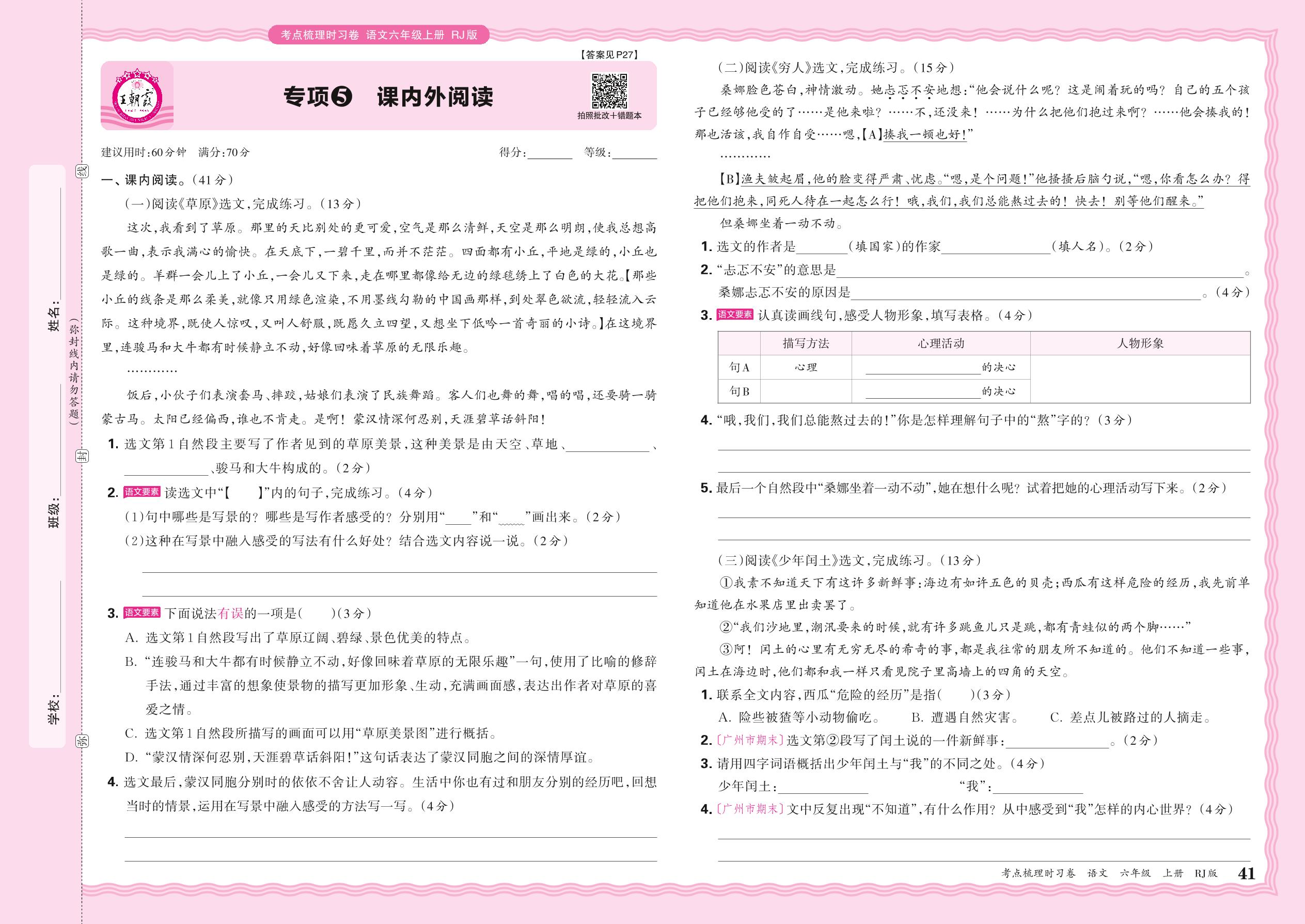 2024秋上册六年级语文人教版 期末专项卷KD版·课内外阅读【5】