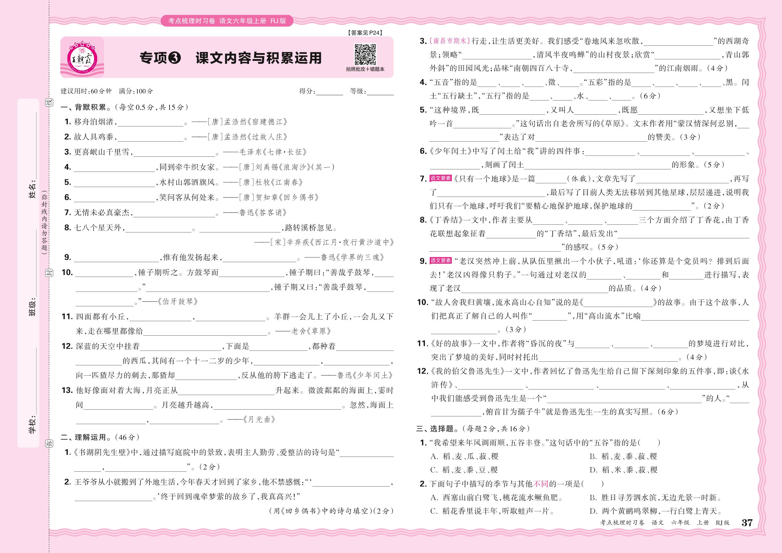 2024秋上册六年级语文人教版 期末专项卷KD版·课文内容与积累运用【3】