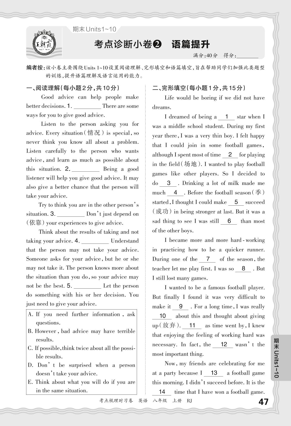 2024秋上册八年级英语人教版 期末Unit 1-10 考点诊断小卷2 语篇提升