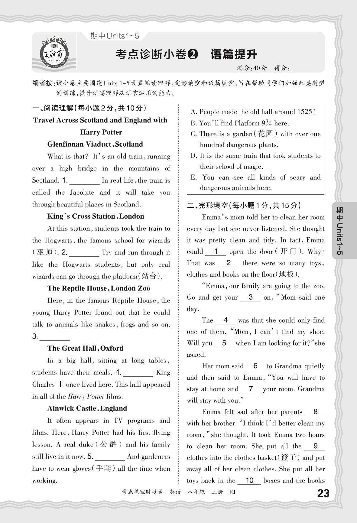 2024秋上册八年级英语人教版 期中Unit 1-5 考点诊断小卷2 语篇提升