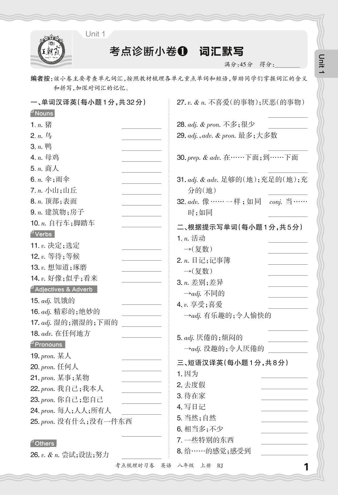 2024秋上册八年级英语人教版 Unit 1 考点诊断小卷1 词汇默写