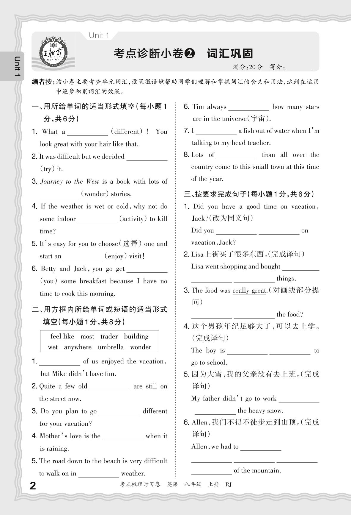 2024秋上册八年级英语人教版 Unit 1 考点诊断小卷2 词汇巩固