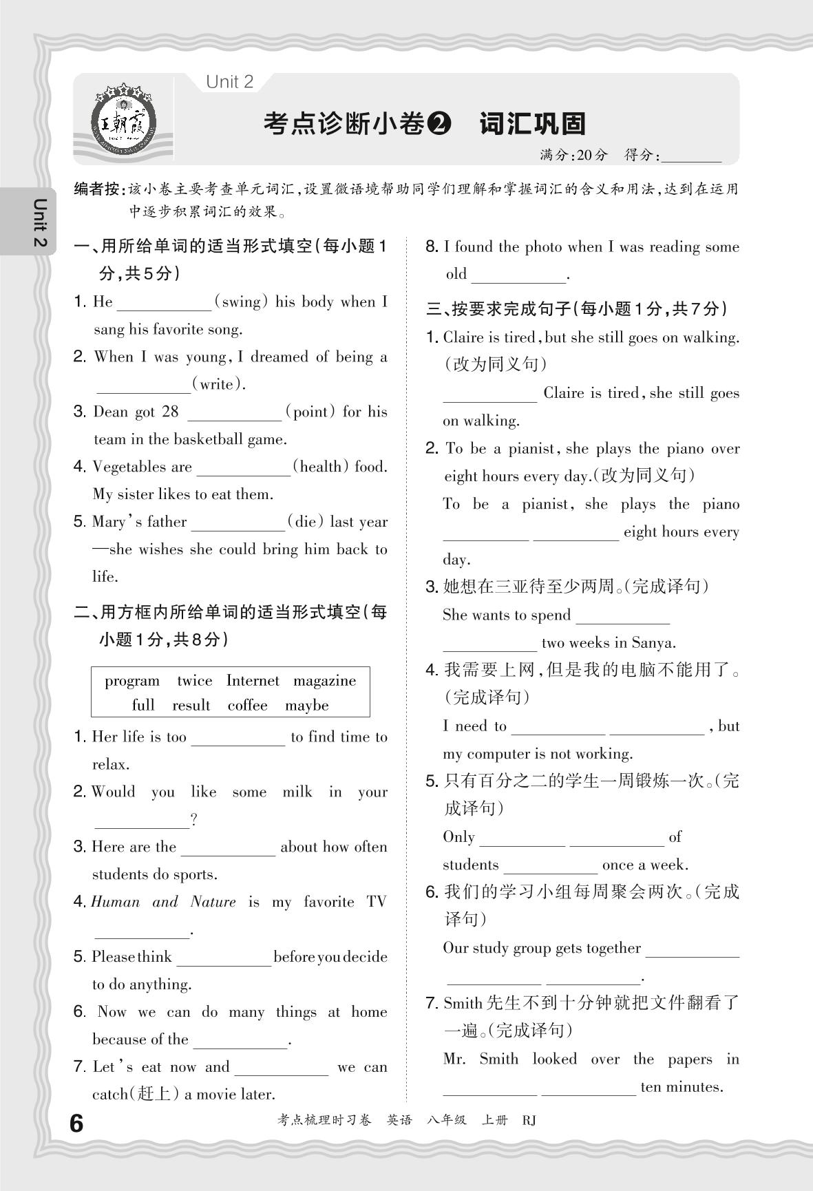 2024秋上册八年级英语人教版 Unit 2 考点诊断小卷2 词汇巩固
