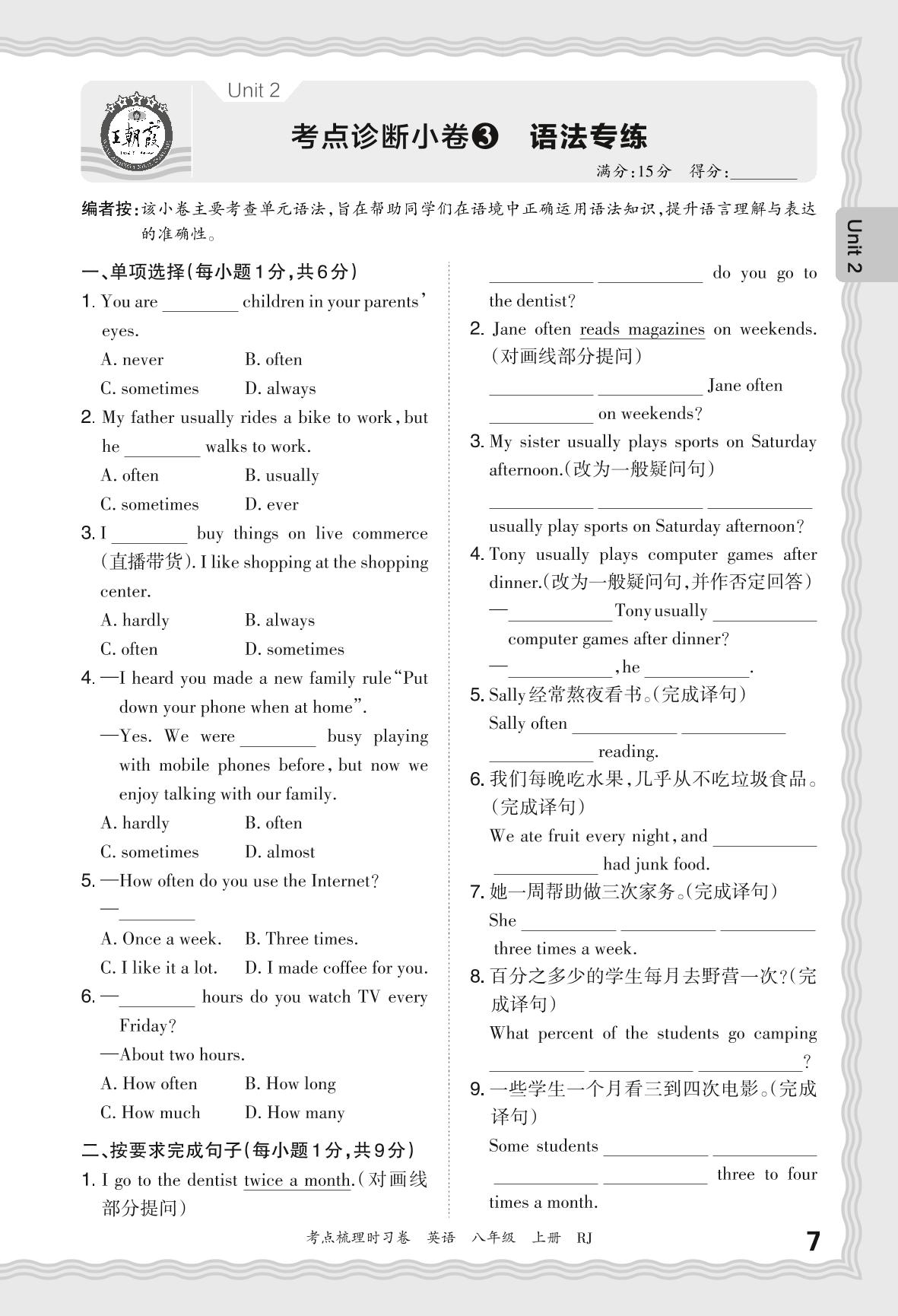 2024秋上册八年级英语人教版 Unit 2 考点诊断小卷3 语法专练