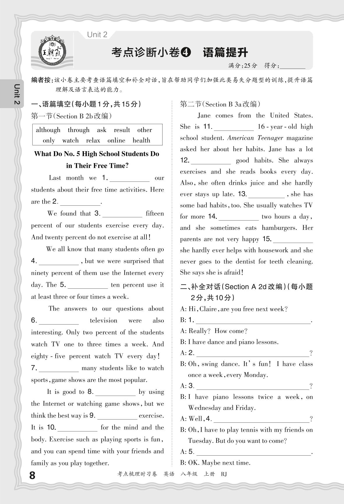 2024秋上册八年级英语人教版 Unit 2 考点诊断小卷4 语篇提升