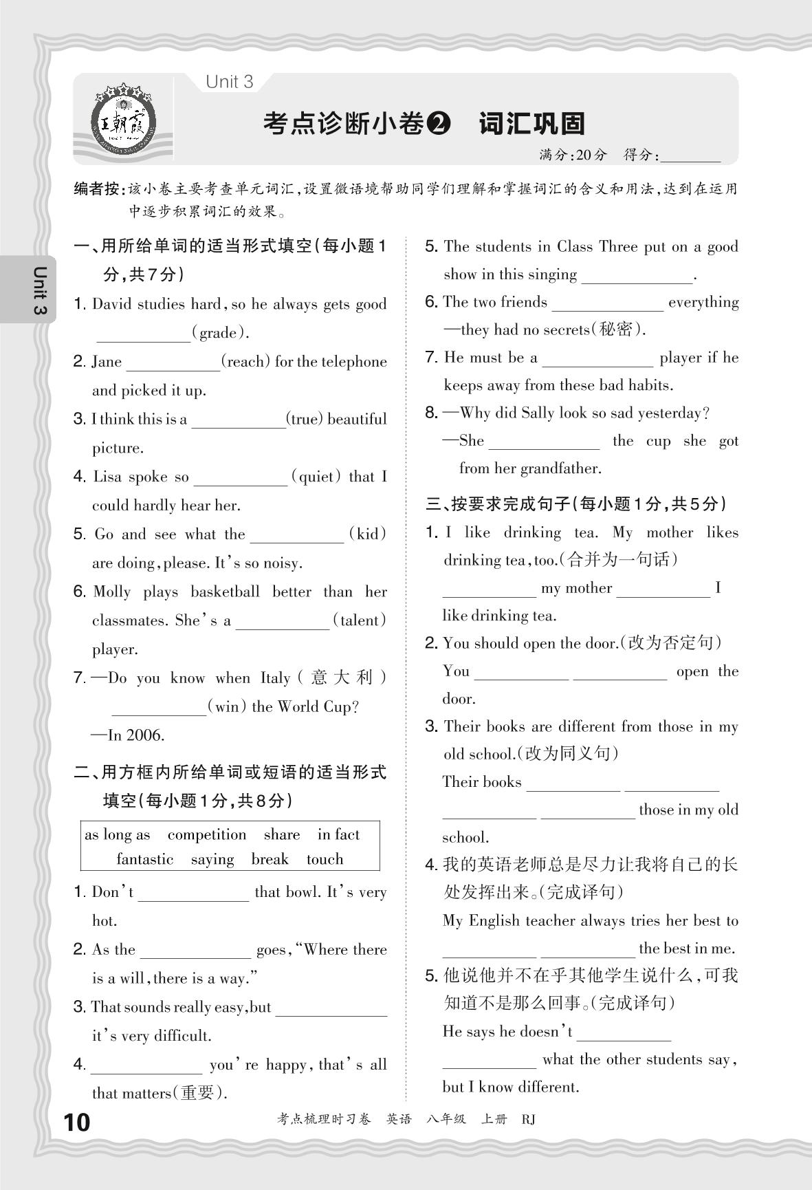 2024秋上册八年级英语人教版 Unit 3 考点诊断小卷2 词汇巩固