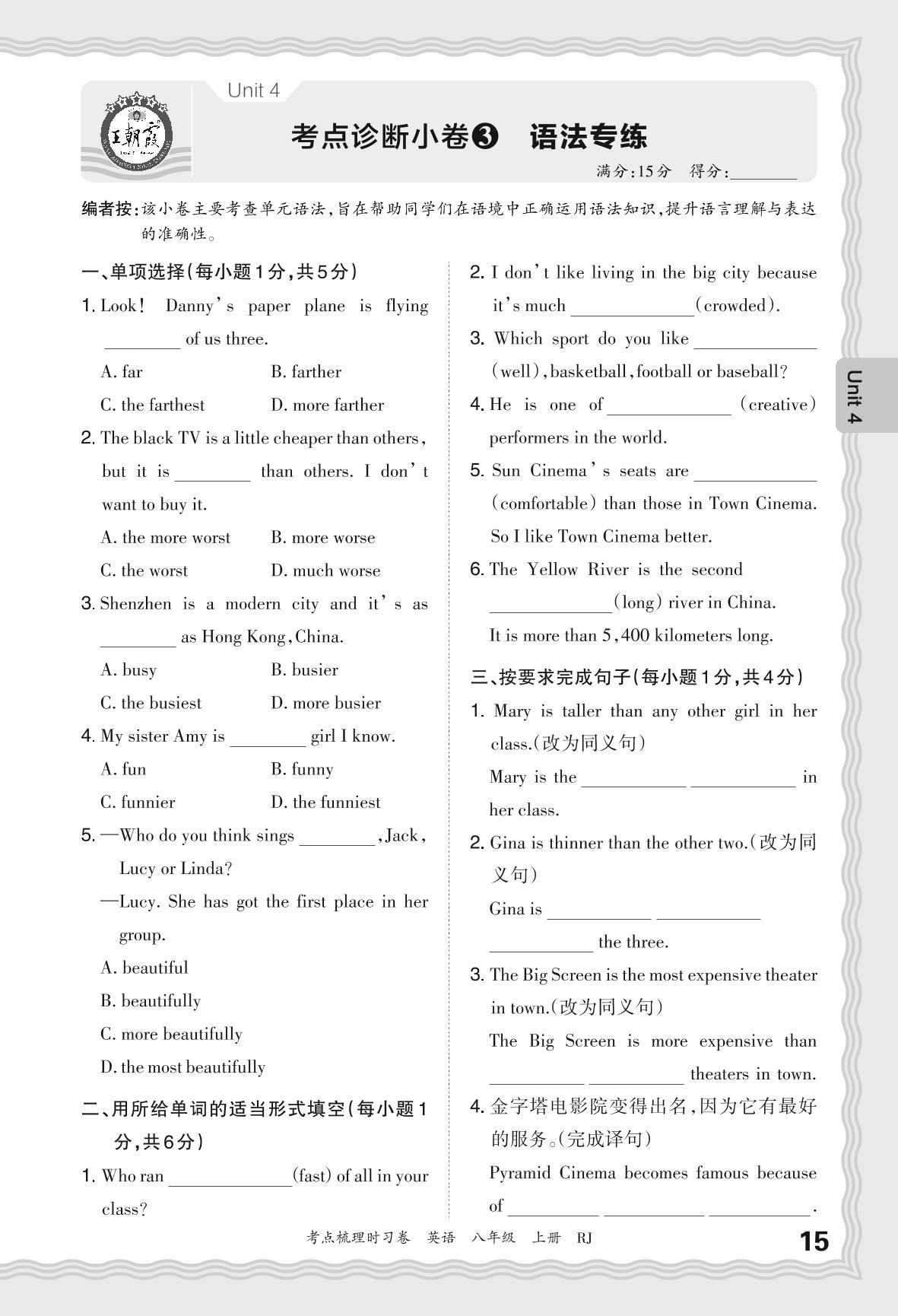 2024秋上册八年级英语人教版 Unit 4 考点诊断小卷3 语法专练