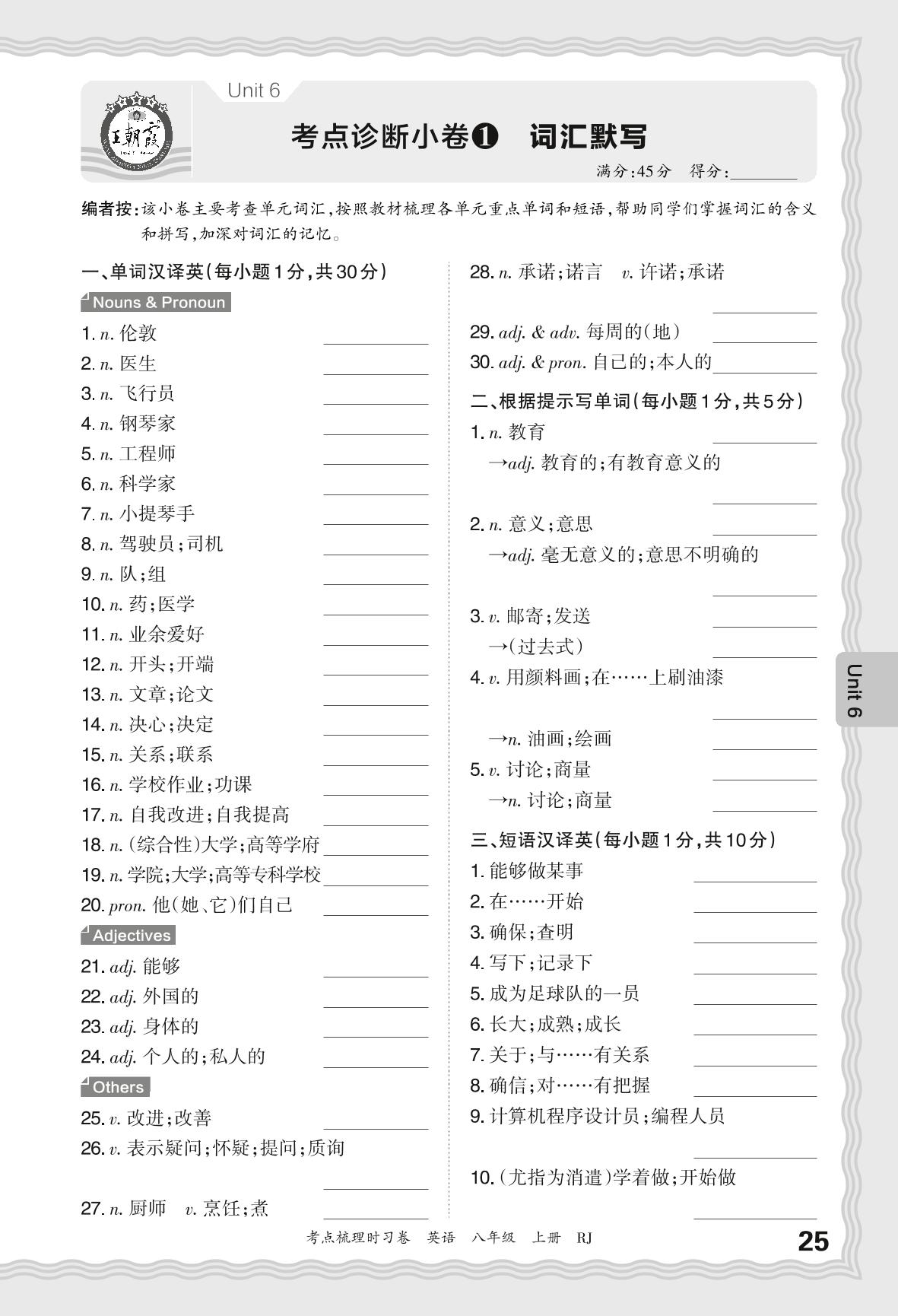 2024秋上册八年级英语人教版 Unit 6 考点诊断小卷1 词汇默写