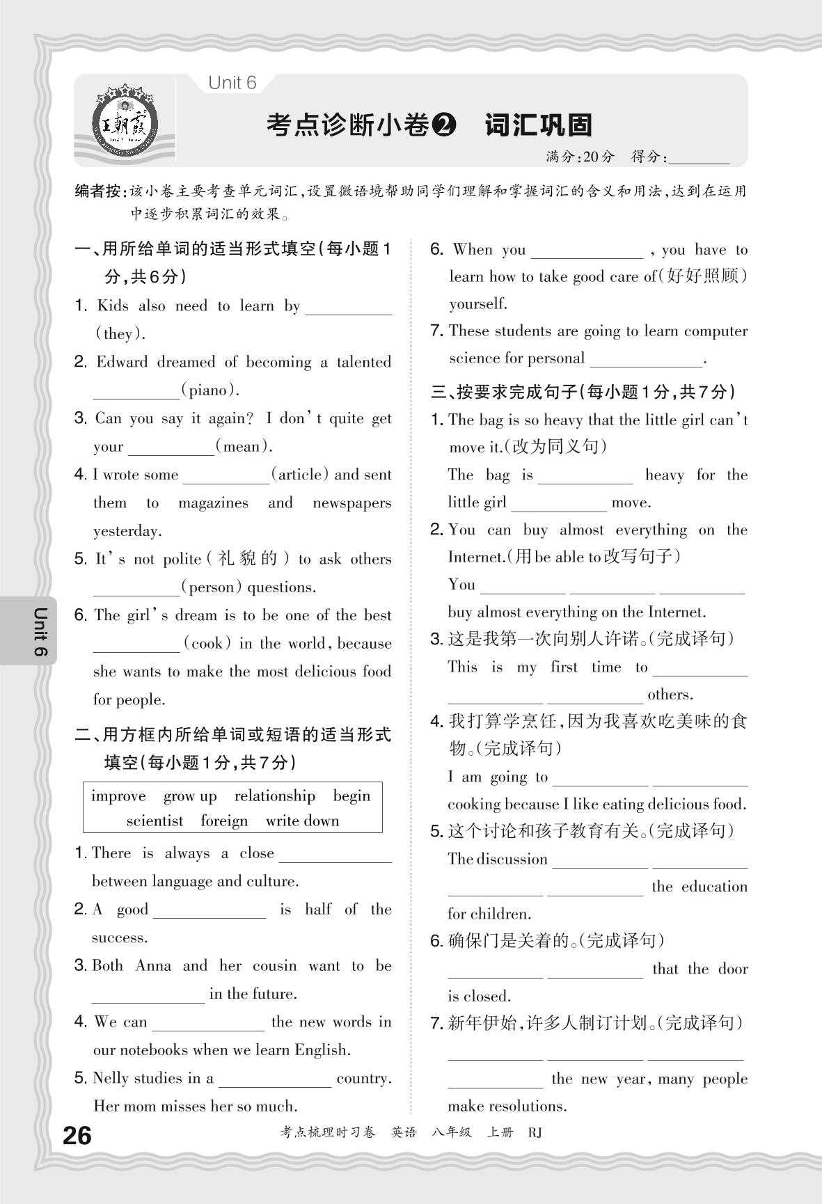 2024秋上册八年级英语人教版 Unit 6 考点诊断小卷2 词汇巩固