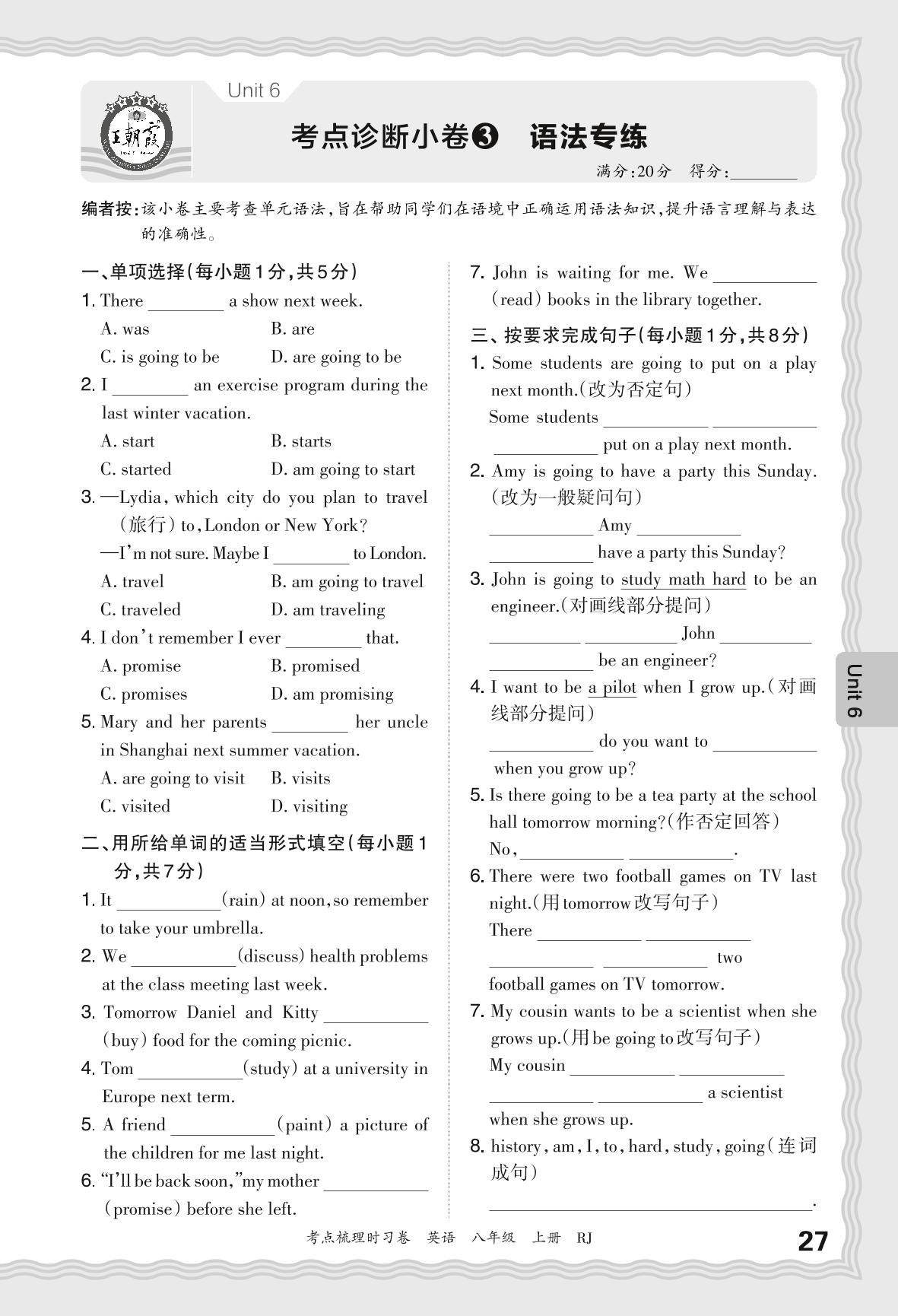 2024秋上册八年级英语人教版 Unit 6 考点诊断小卷3 语法专练